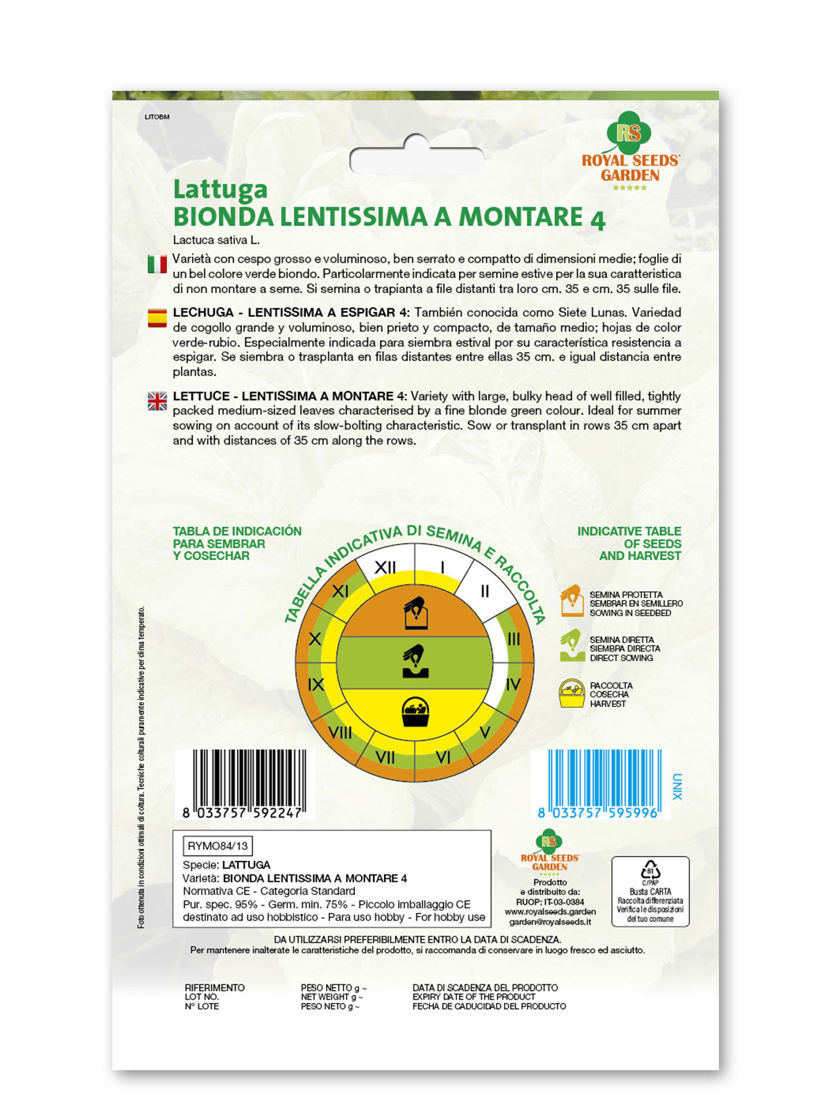 Lattuga bionda lentissima a montare 4 – Varietà con cespo grosso e voluminoso, ben serrato e compatto di dimensioni medie; foglie di un bel colore verde biondo. Particolarmente indicata per semine estive per la sua caratteristica di non montare a seme. Si semina o trapianta a file distanti tra loro cm. 35 e cm. 35 sulle file.