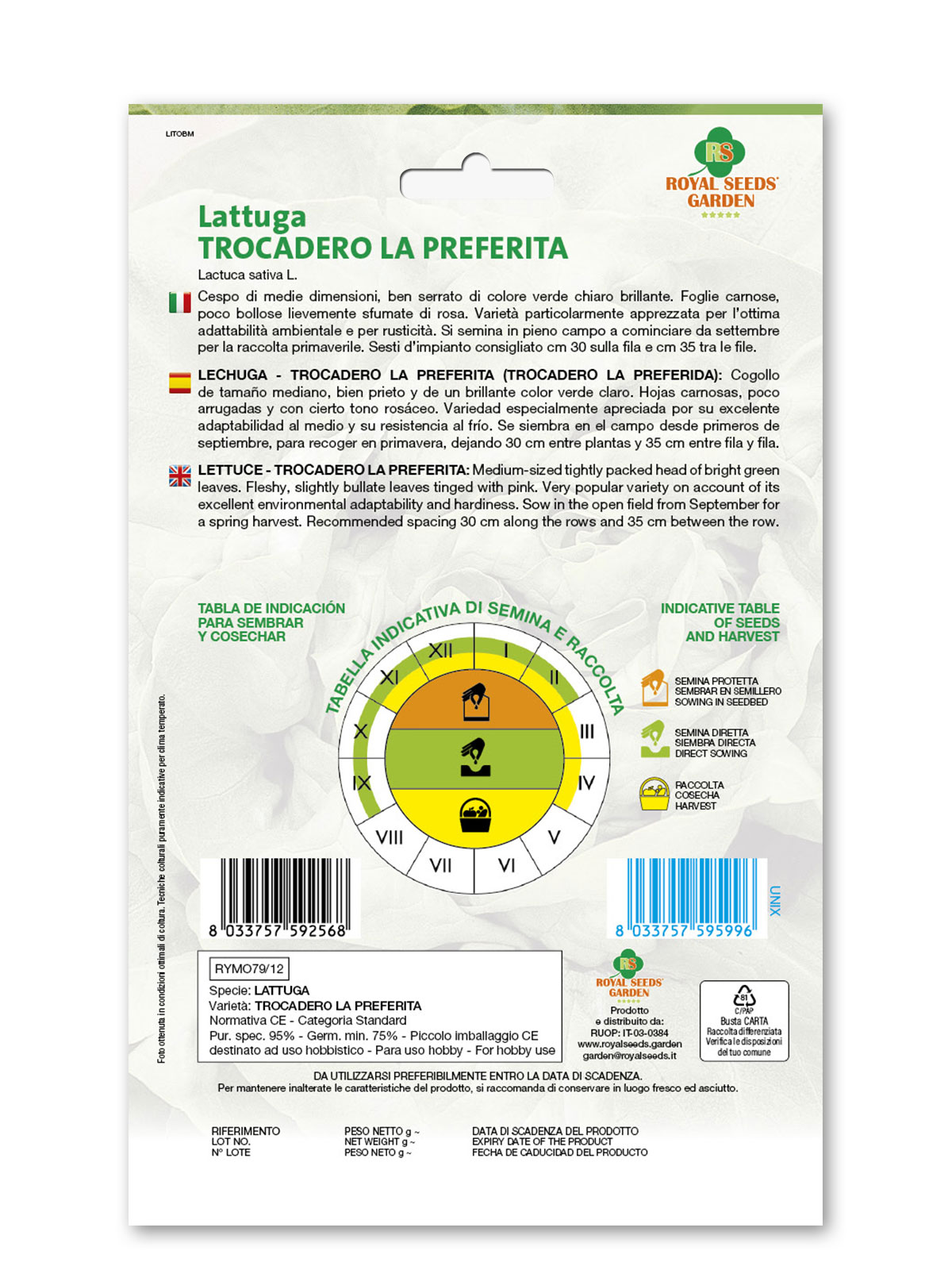 Lattuga Trocadero la preferita – Cespo di medie dimensioni, ben serrato di colore verde chiaro brillante. Foglie carnose, poco bollose lievemente sfumate di rosa. Varietà particolarmente apprezzata per l’ottima adattabilità ambientale e per rusticità. Si semina in pieno campo a cominciare da settembre per la raccolta primaverile. Sesti d’impianto consigliato cm 30 sulla fila e cm 35 tra le file.