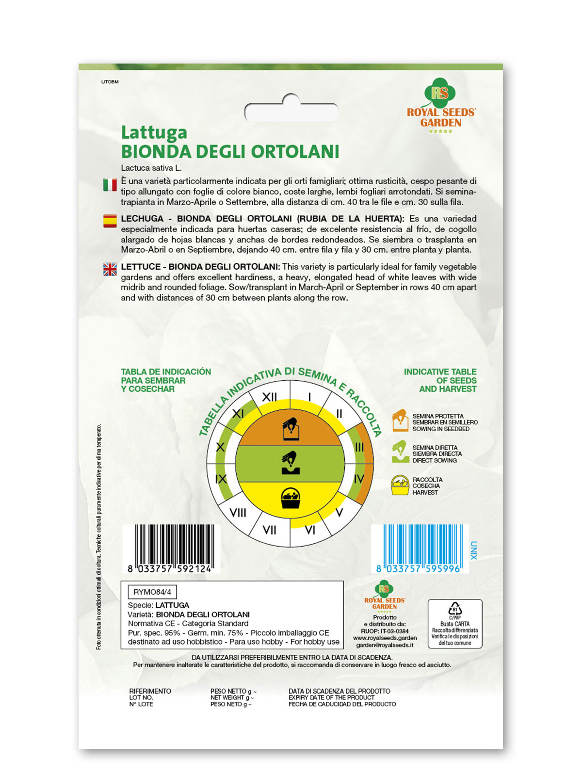 Lattuga bionda degli ortolani – È una varietà particolarmente indicata per gli orti famigliari; ottima rusticità, cespo pesante di tipo allungato con foglie di colore bianco, coste larghe, lembi fogliari arrotondati. Si seminatrapianta in Marzo-Aprile o Settembre, alla distanza di cm. 40 tra le file e cm. 30 sulla fila.