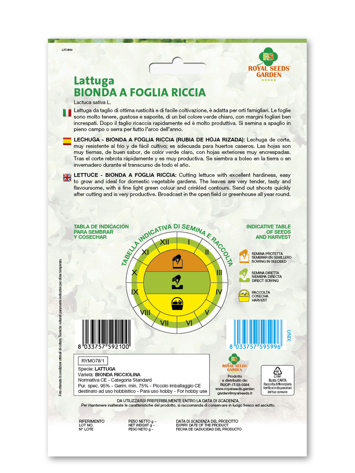 Lattuga bionda a foglia riccia – Lattuga da taglio di ottima rusticità e di facile coltivazione, è adatta per orti famigliari. Le foglie sono molto tenere, gustose e saporite, di un bel colore verde chiaro, con margini fogliari ben increspati. Dopo il taglio ricaccia rapidamente ed è molto produttiva. Si semina a spaglio in pieno campo o serra per tutto l’arco dell’anno.