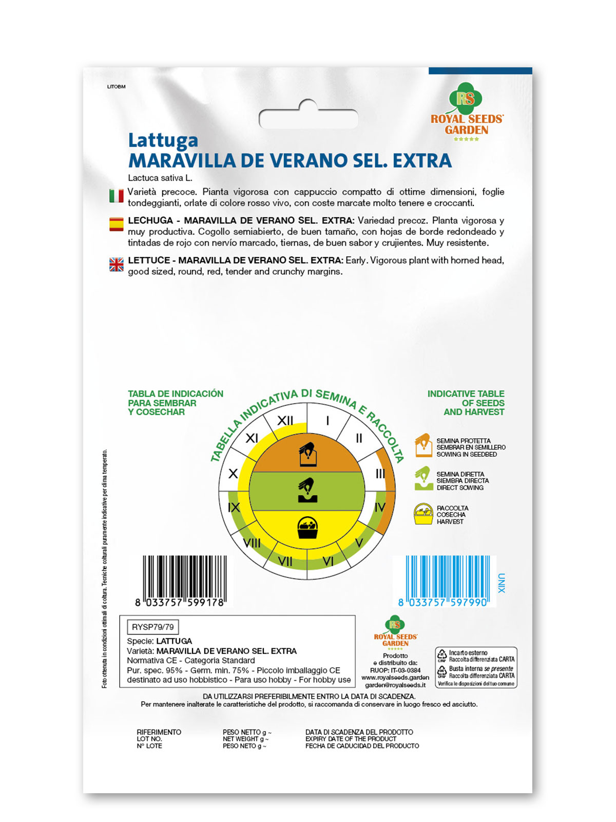 Lattuga Maravilla de Verano Sel. Extra – Varietà precoce. Pianta vigorosa con cappuccio compatto di ottime dimensioni, foglie tondeggianti, orlate di colore rosso vivo, con coste marcate molto tenere e croccanti.