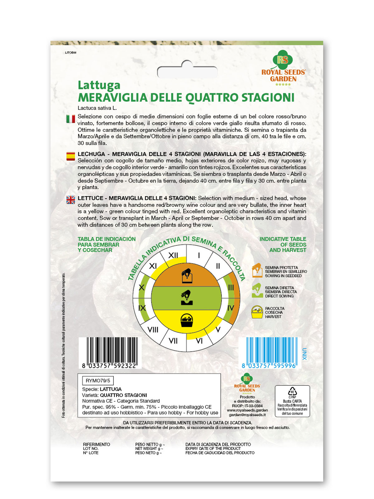 Lattuga meraviglia delle quattro stagioni – Selezione con cespo di medie dimensioni con foglie esterne di un bel colore rosso/bruno vinato, fortemente bollose, il cespo interno di colore verde giallo risulta sfumato di rosso. Ottime le caratteristiche organolettiche e le proprietà vitaminiche. Si semina o trapianta da Marzo/Aprile e da Settembre/Ottobre in pieno campo alla distanza di cm. 40 tra le file e cm. 30 sulla fila.