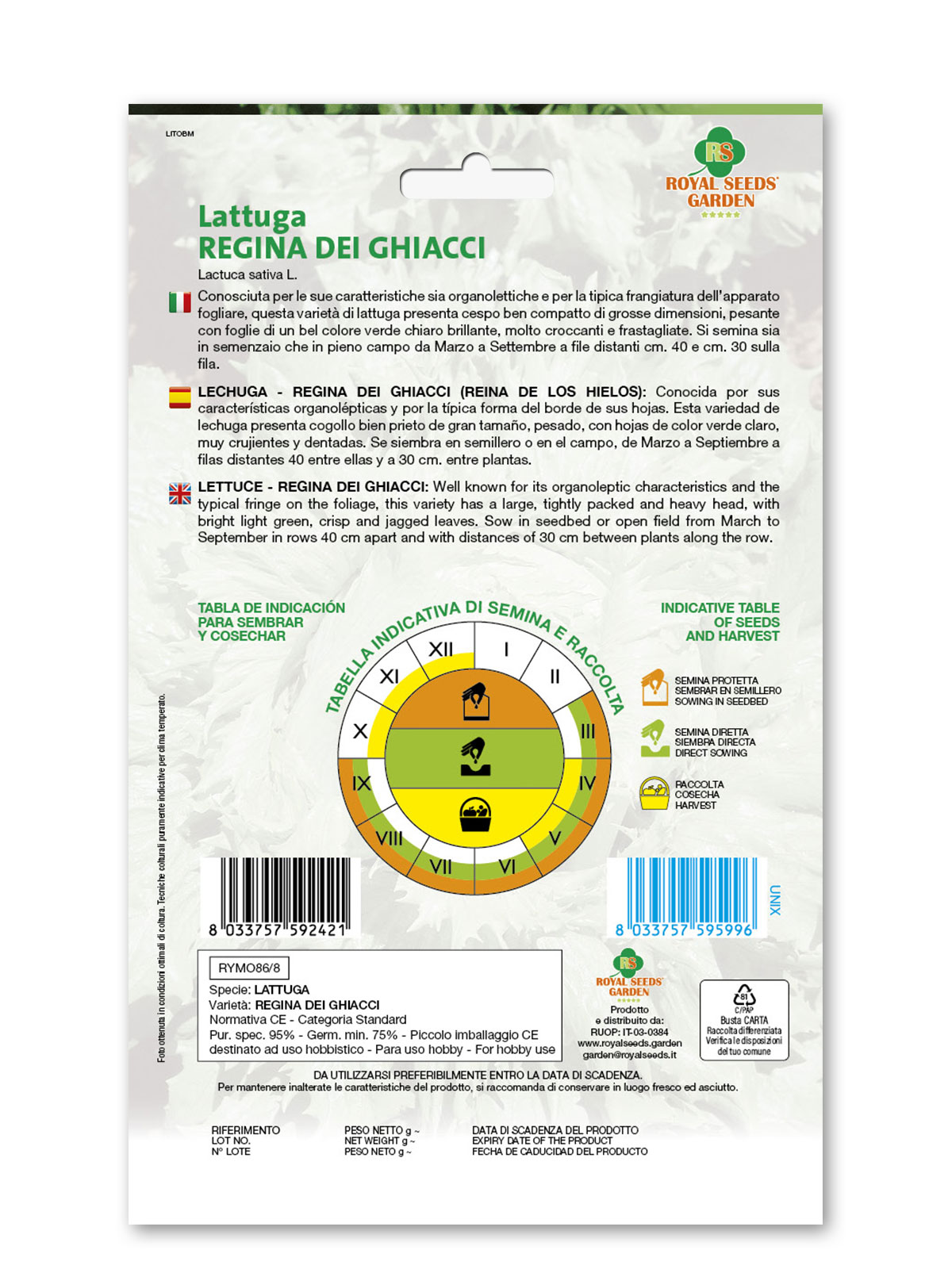 Lattuga Regina dei ghiacci – Conosciuta per le sue caratteristiche sia organolettiche e per la tipica frangiatura dell’apparato fogliare, questa varietà di lattuga presenta cespo ben compatto di grosse dimensioni, pesante con foglie di un bel colore verde chiaro brillante, molto croccanti e frastagliate. Si semina sia in semenzaio che in pieno campo da Marzo a Settembre a file distanti cm. 40 e cm. 30 sulla fila.