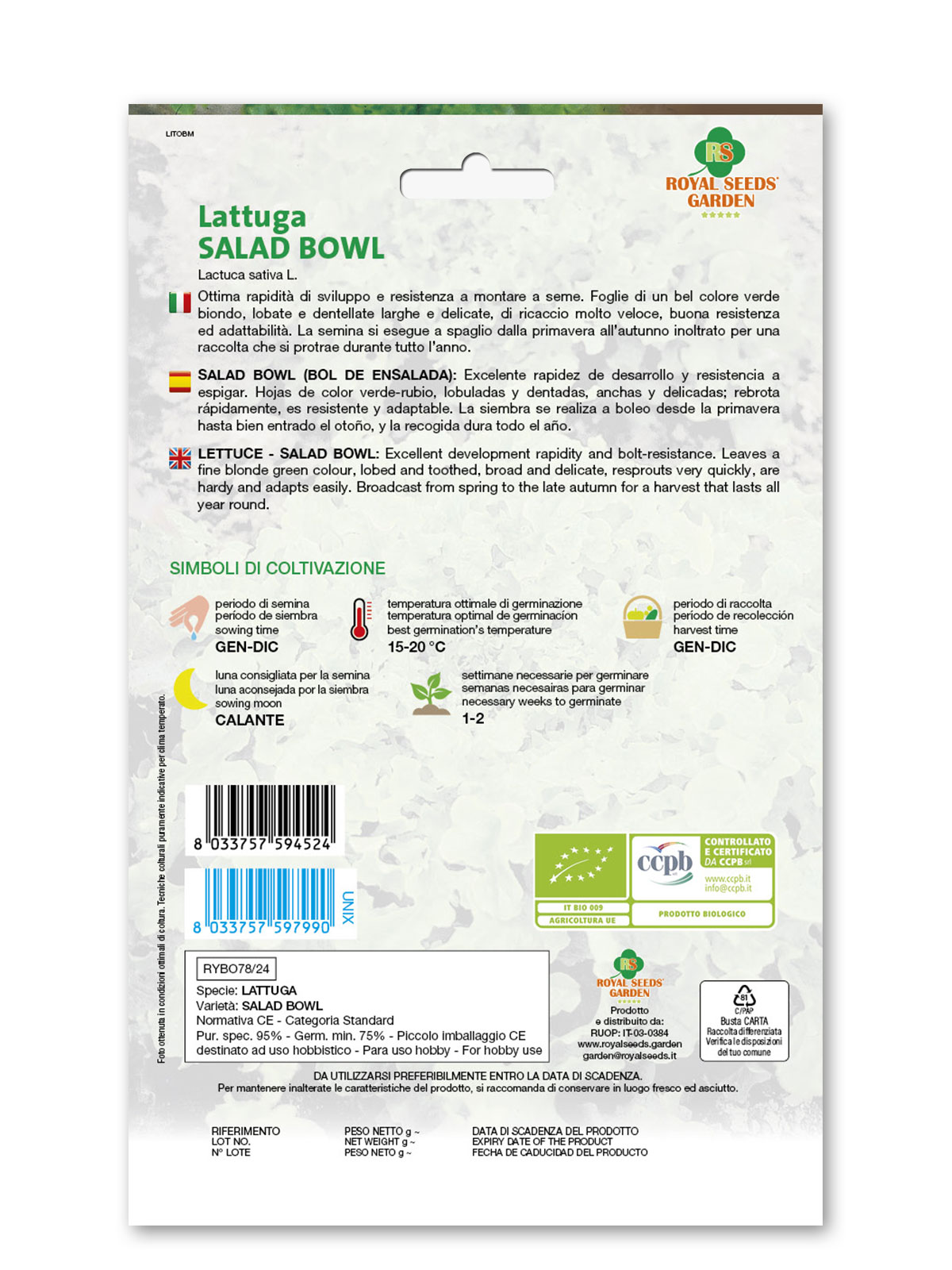 Lattuga Salad bowl – Ottima rapidità di sviluppo e resistenza a montare a seme. Foglie di un bel colore verde biondo, lobate e dentellate larghe e delicate, di ricaccio molto veloce, buona resistenza ed adattabilità. La semina si esegue a spaglio dalla primavera all’autunno inoltrato per una