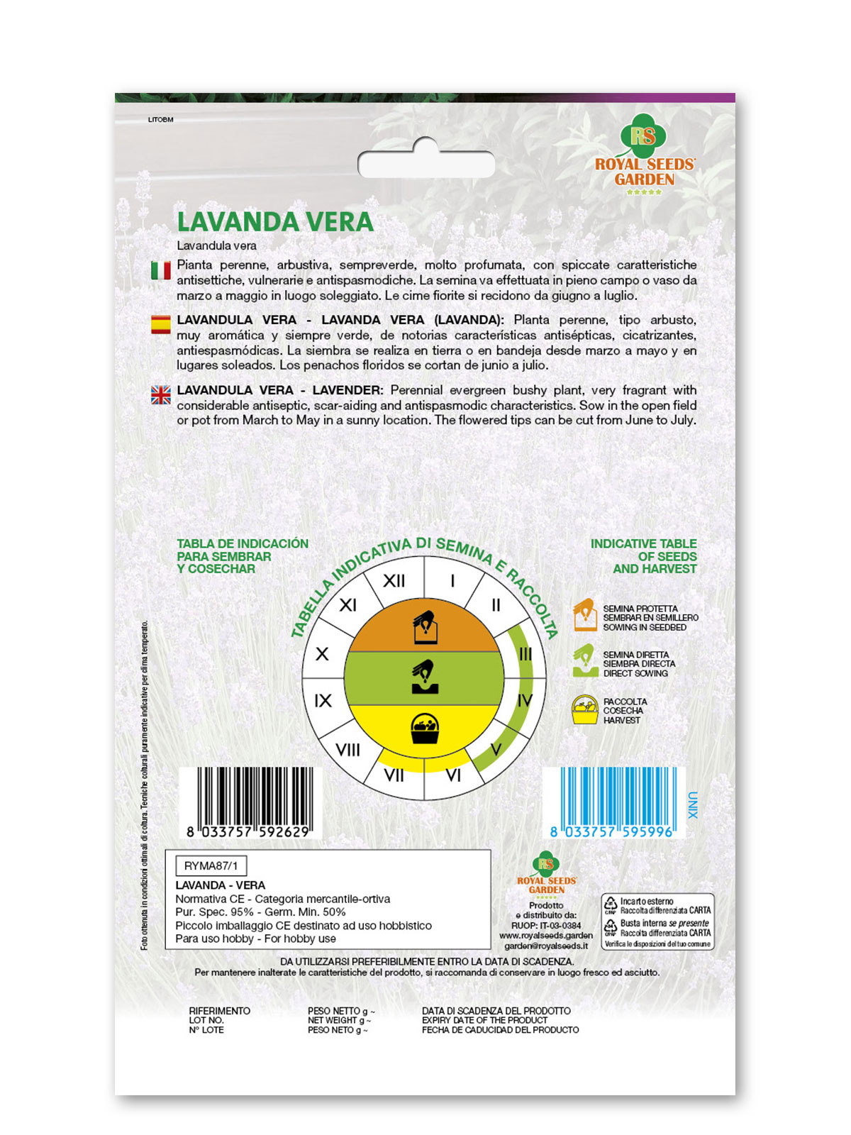 Lavanda vera – Pianta perenne, arbustiva, sempreverde, molto profumata, con spiccate caratteristiche antisettiche, vulnerarie e antispasmodiche. La semina va effettuata in pieno campo o vaso da marzo a maggio in luogo soleggiato. Le cime fiorite si recidono da giugno a luglio.