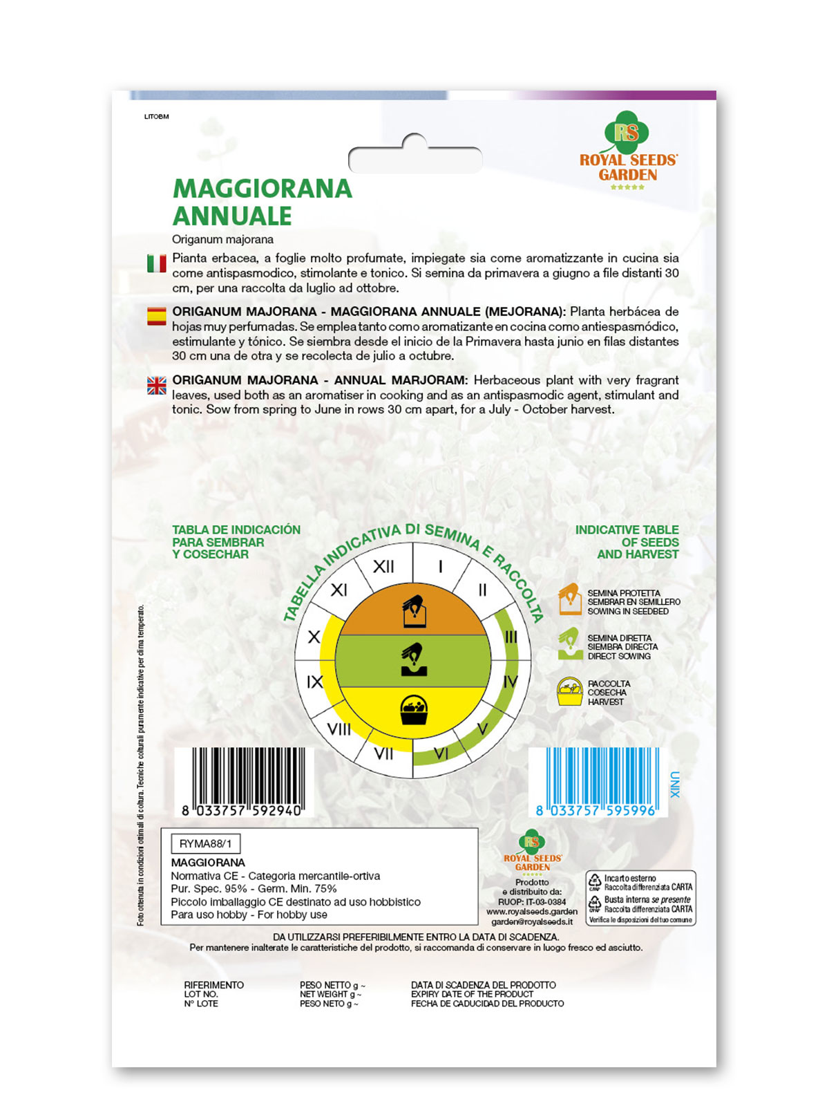 Maggiorana annuale – Pianta erbacea, a foglie molto profumate, impiegate sia come aromatizzante in cucina sia come antispasmodico, stimolante e tonico. Si semina da primavera a giugno a file distanti 30 cm, per una raccolta da luglio ad ottobre.