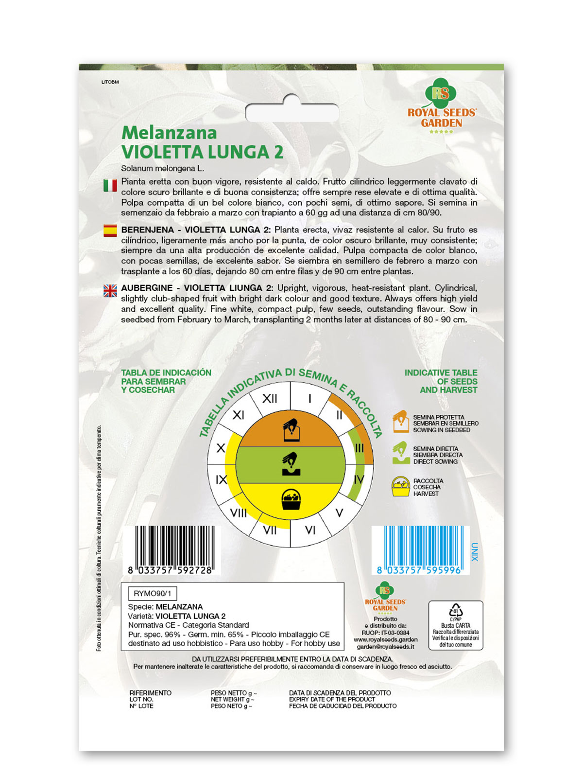 Melanzana Violetta lunga 2 – Pianta eretta con buon vigore, resistente al caldo. Frutto cilindrico leggermente clavato di colore scuro brillante e di buona consistenza; offre sempre rese elevate e di ottima qualità. Polpa compatta di un bel colore bianco, con pochi semi, di ottimo sapore. Si semina in semenzaio da febbraio a marzo con trapianto a 60 gg ad una distanza di cm 80/90.