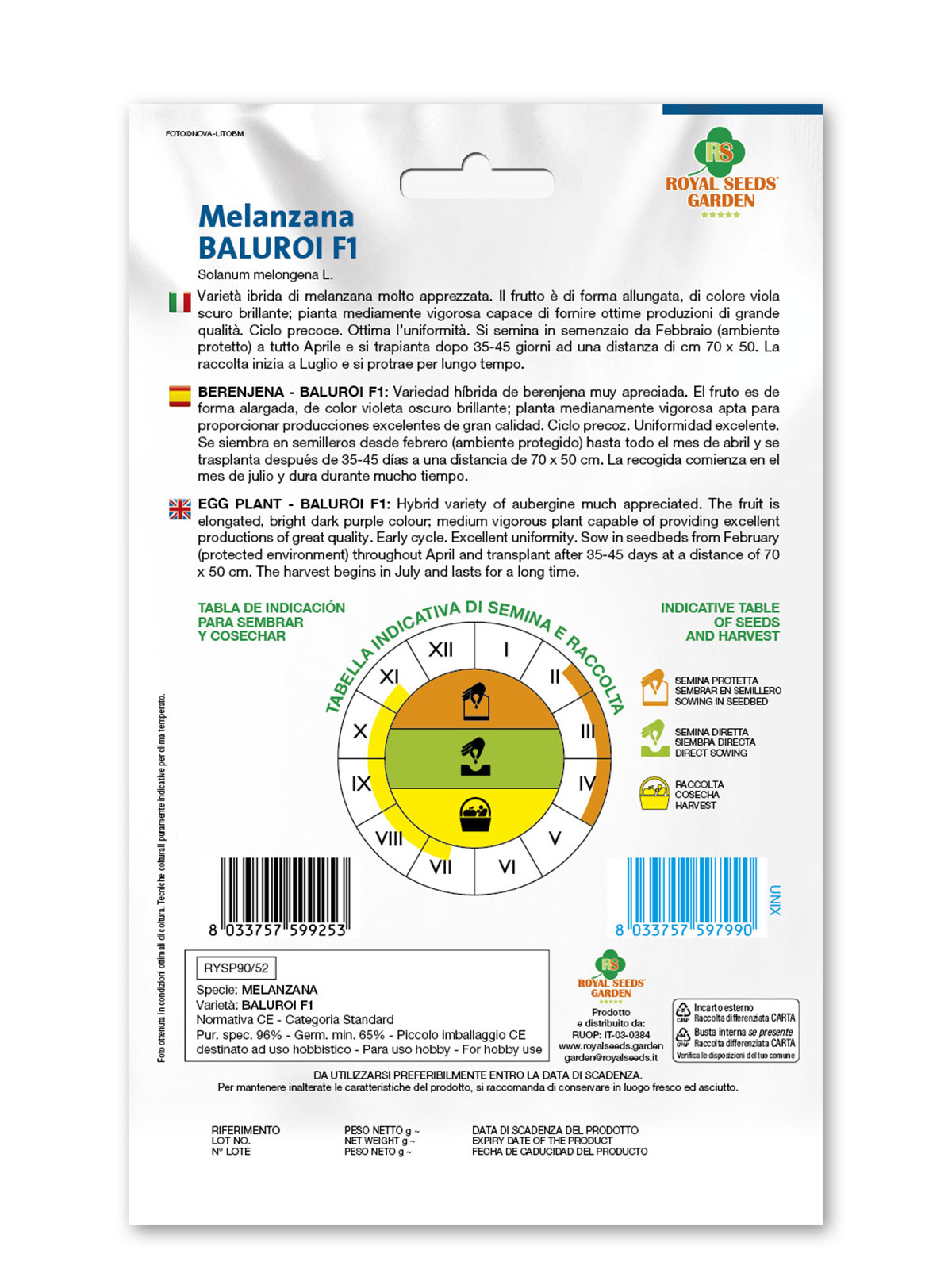 Melanzana Baluroi F1 – Varietà ibrida di melanzana molto apprezzata. Il frutto è di forma allungata, di colore viola scuro brillante; pianta mediamente vigorosa capace di fornire ottime produzioni di grande qualità. Ciclo precoce. Ottima l’uniformità. Si semina in semenzaio da Febbraio (ambiente protetto) a tutto Aprile e si trapianta dopo 35-45 giorni ad una distanza di cm 70 x 50. La raccolta inizia a Luglio e si protrae per lungo tempo.