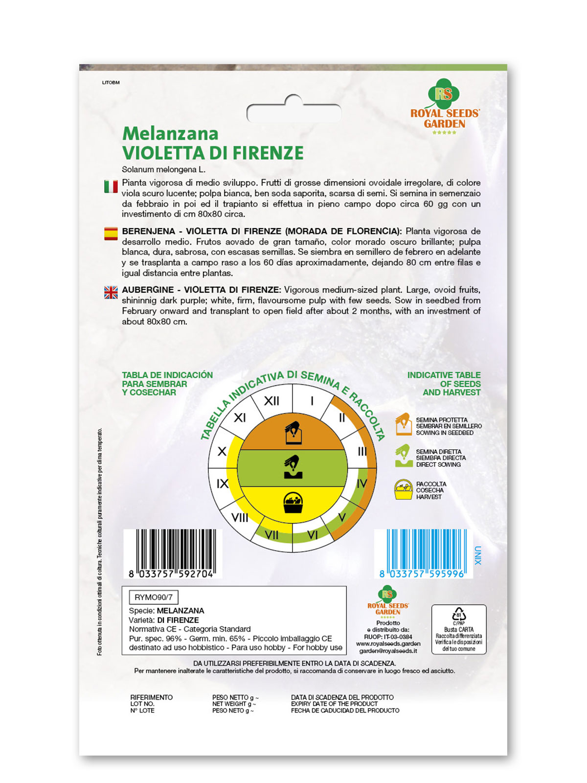 Eggplant violetta di Firenze – Vigorous medium-sized plant. Large, ovoid fruits, shininnig dark purple; white, firm, flavoursome pulp with few seeds. Sow in seedbed from February onward and transplant to open field after about 2 months, with an investment of about 80×80 cm.