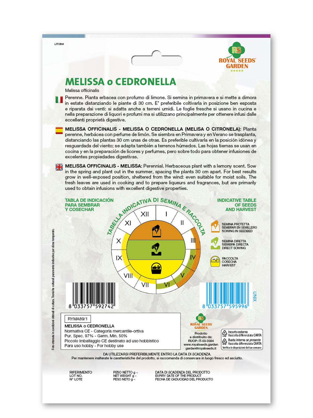 Melissa – Perenne. Pianta erbacea con profumo di limone. Si semina in primavera e si mette a dimora