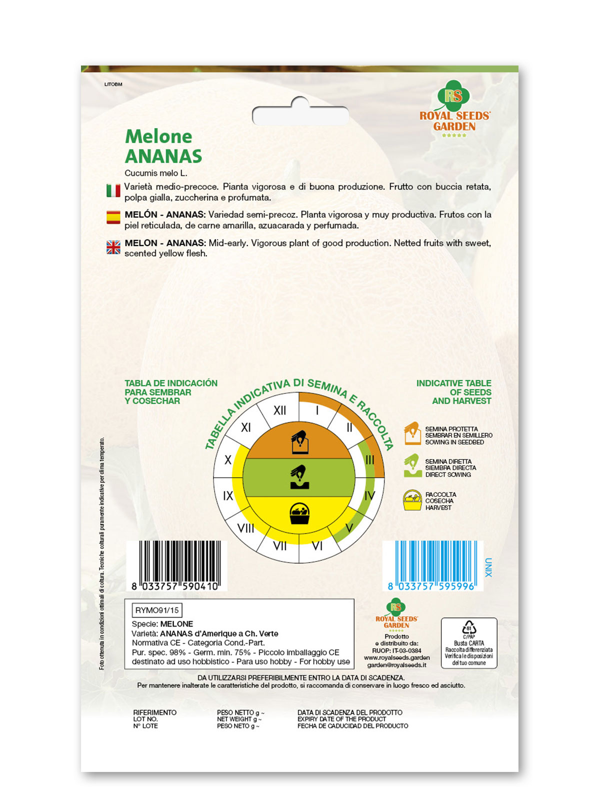 Melone Ananas – Varietà medio-precoce. Pianta vigorosa e di buona produzione. Frutto con buccia retata, polpa gialla, zuccherina e profumata.