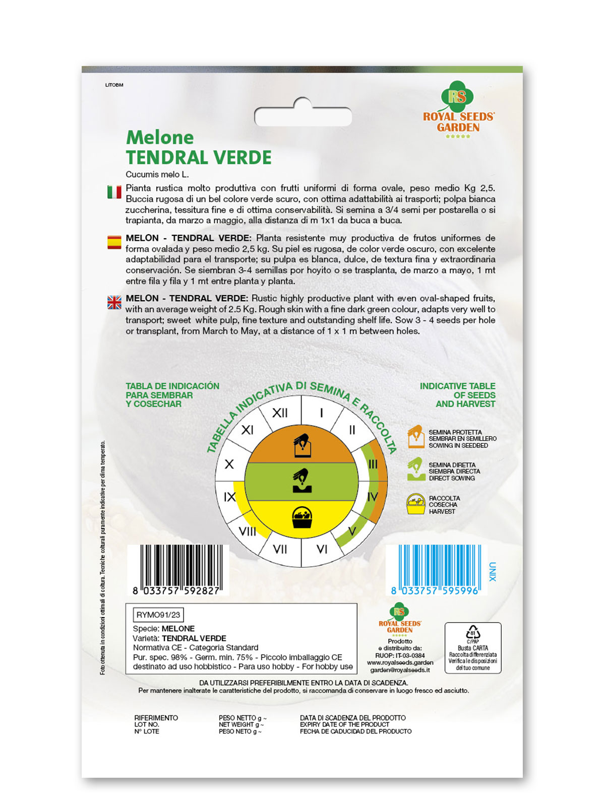 Melone tendral verde – Pianta rustica molto produttiva con frutti uniformi di forma ovale, peso medio Kg 2,5. Buccia rugosa di un bel colore verde scuro, con ottima adattabilità ai trasporti; polpa bianca zuccherina, tessitura fine e di ottima conservabilità. Si semina a 3/4 semi per postarella o si trapianta, da marzo a maggio, alla distanza di m 1×1 da buca a buca.