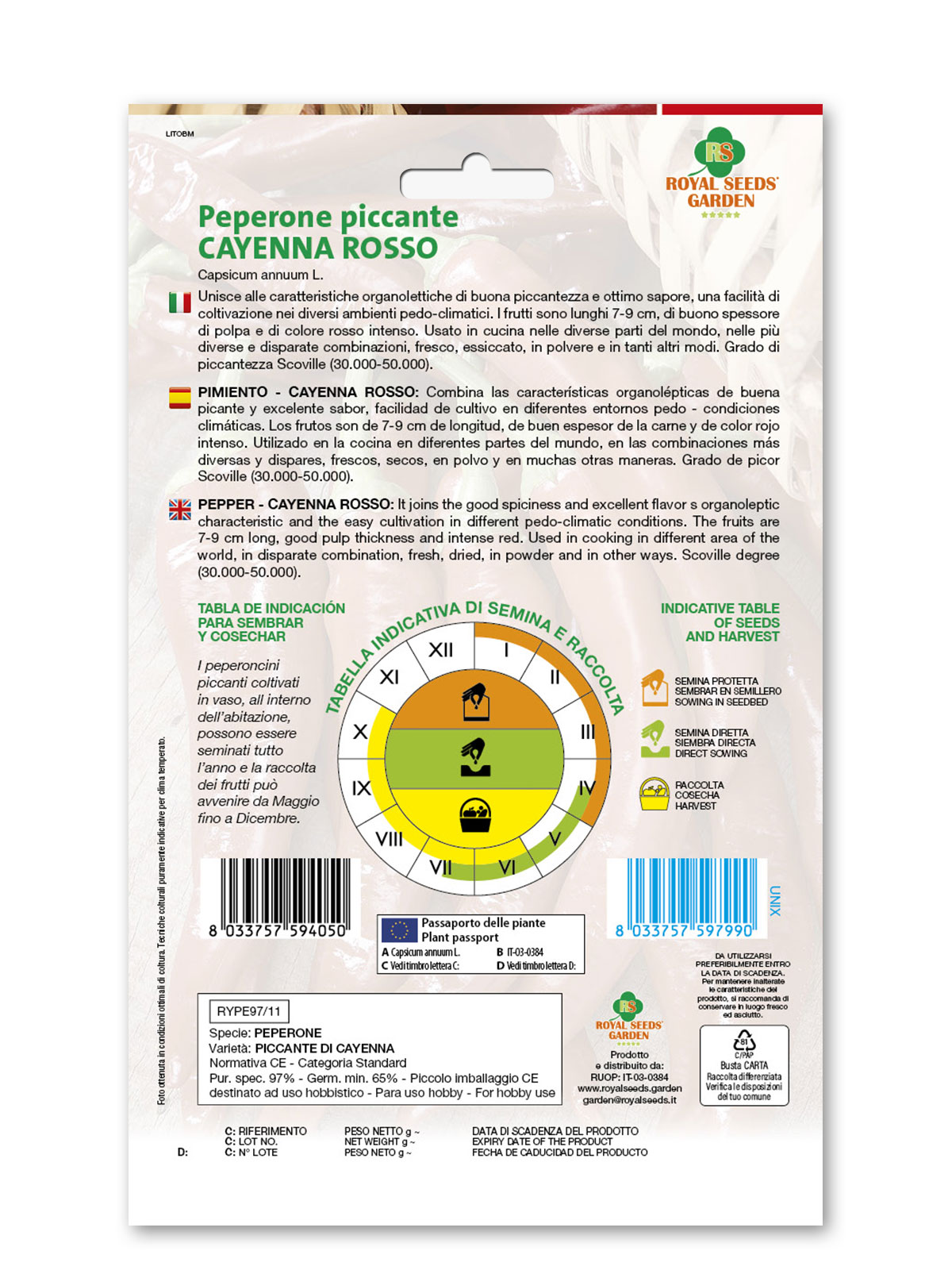 Peperoncino Cayenna Rosso – Unisce alle caratteristiche organolettiche di buona piccantezza e ottimo sapore, una facilità di coltivazione nei diversi ambienti pedo-climatici. I frutti sono lunghi 7-9 cm, di buono spessore di polpa e di colore rosso intenso. Usato in cucina nelle diverse parti del mondo, nelle più diverse e disparate combinazioni, fresco, essiccato, in polvere e in tanti altri modi. Grado di
