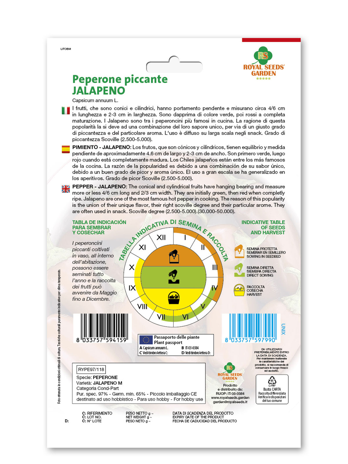 Peperoncino Jalapeno – I frutti, che sono conici e cilindrici, hanno portamento pendente e misurano circa 4/6 cm in lunghezza e 2-3 cm in larghezza. Sono dapprima di colore verde, poi rossi a completa maturazione. I Jalapeno sono tra i peperoncini più famosi in cucina. La ragione di questa popolarità la si deve ad una combinazione del loro sapore unico, per via di un giusto grado di piccantezza e del particolare aroma. L‘uso è diffuso su larga scala negli snack. Grado di piccantezza Scoville (2.500-5.000).