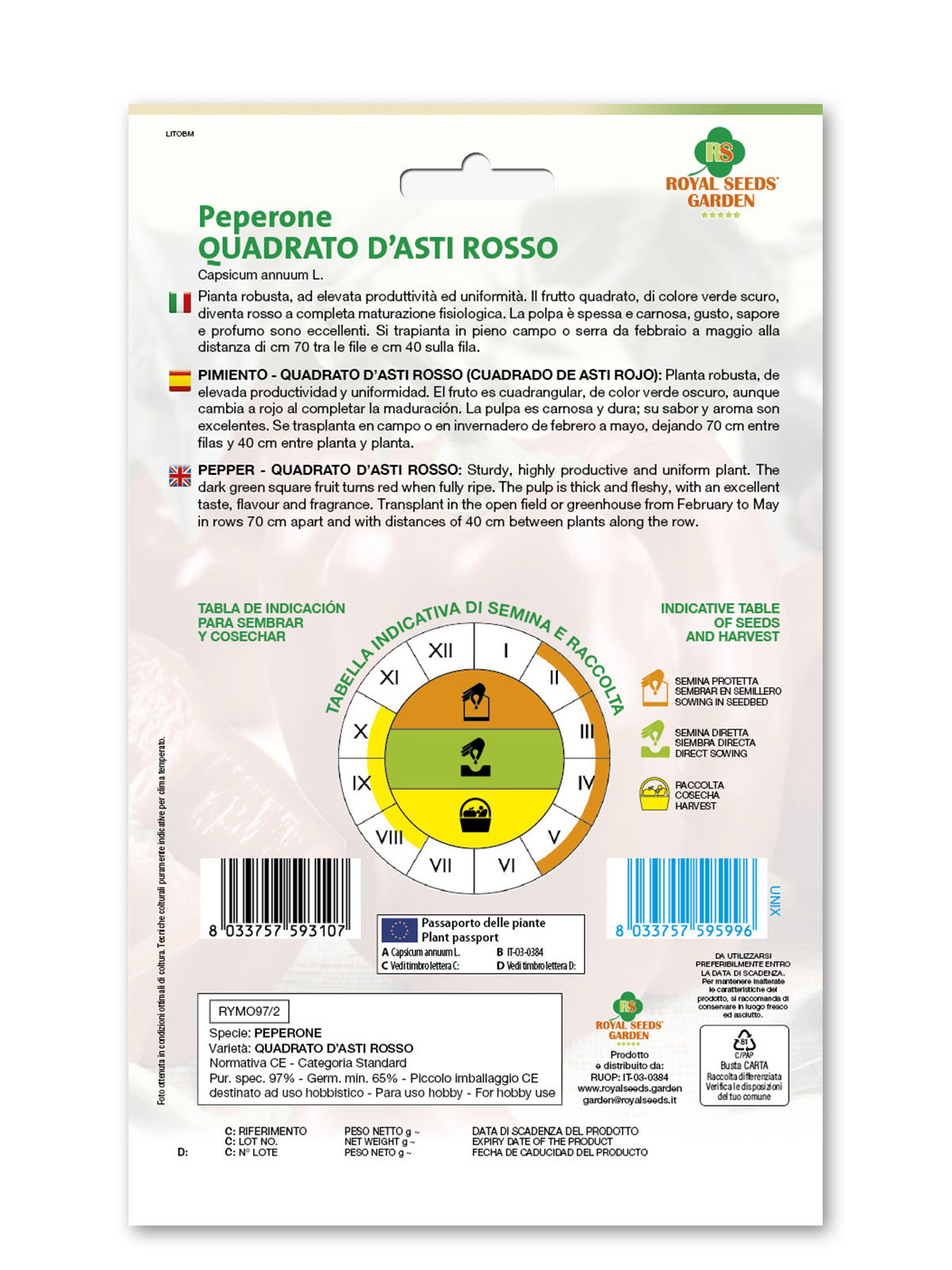 Peperone quadrato d’Asti rosso – Pianta robusta, ad elevata produttività ed uniformità. Il frutto quadrato, di colore verde scuro, diventa rosso a completa maturazione fisiologica. La polpa è spessa e carnosa, gusto, sapore e profumo sono eccellenti. Si trapianta in pieno campo o serra da febbraio a maggio alla distanza di cm 70 tra le file e cm 40 sulla fila.