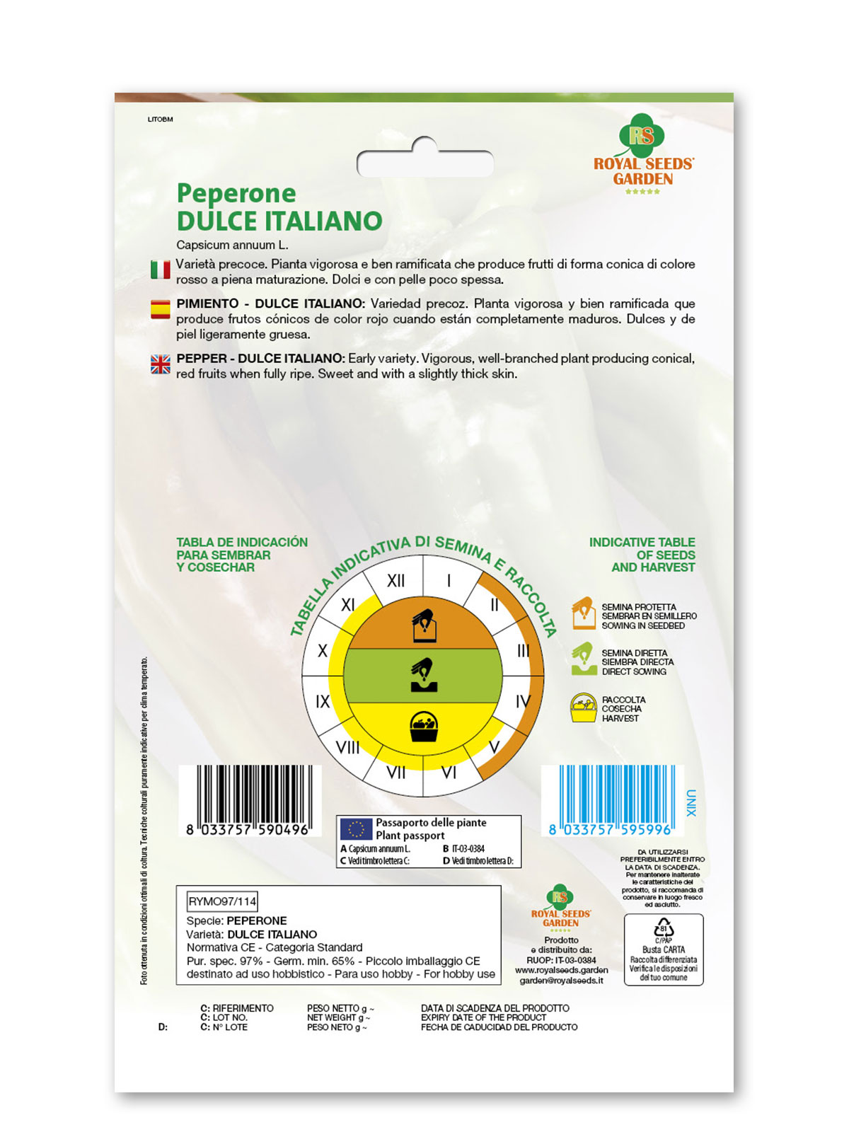 Peperone dulce italiano – Varietà precoce. Pianta vigorosa e ben ramificata che produce frutti di forma conica di colore rosso a piena maturazione. Dolci e con pelle poco spessa.
