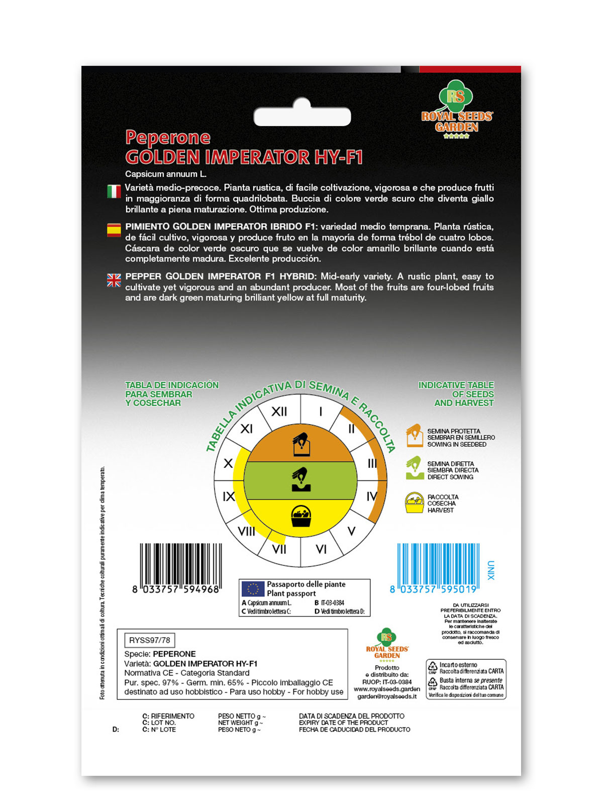 Peperone Golden imperator HY F1 – Varietà medio-precoce. Pianta rustica, di facile coltivazione, vigorosa e che produce frutti in maggioranza di forma quadrilobata. Buccia di colore verde scuro che diventa giallo brillante a piena maturazione. Ottima produzione.