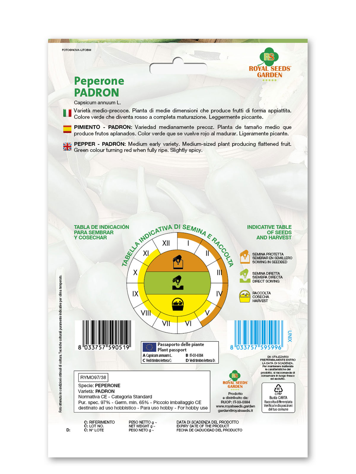 Pepper Padron – Medium early variety. Medium-sized plant producing flattened fruit. Green colour turning red when fully ripe. Slightly spicy.