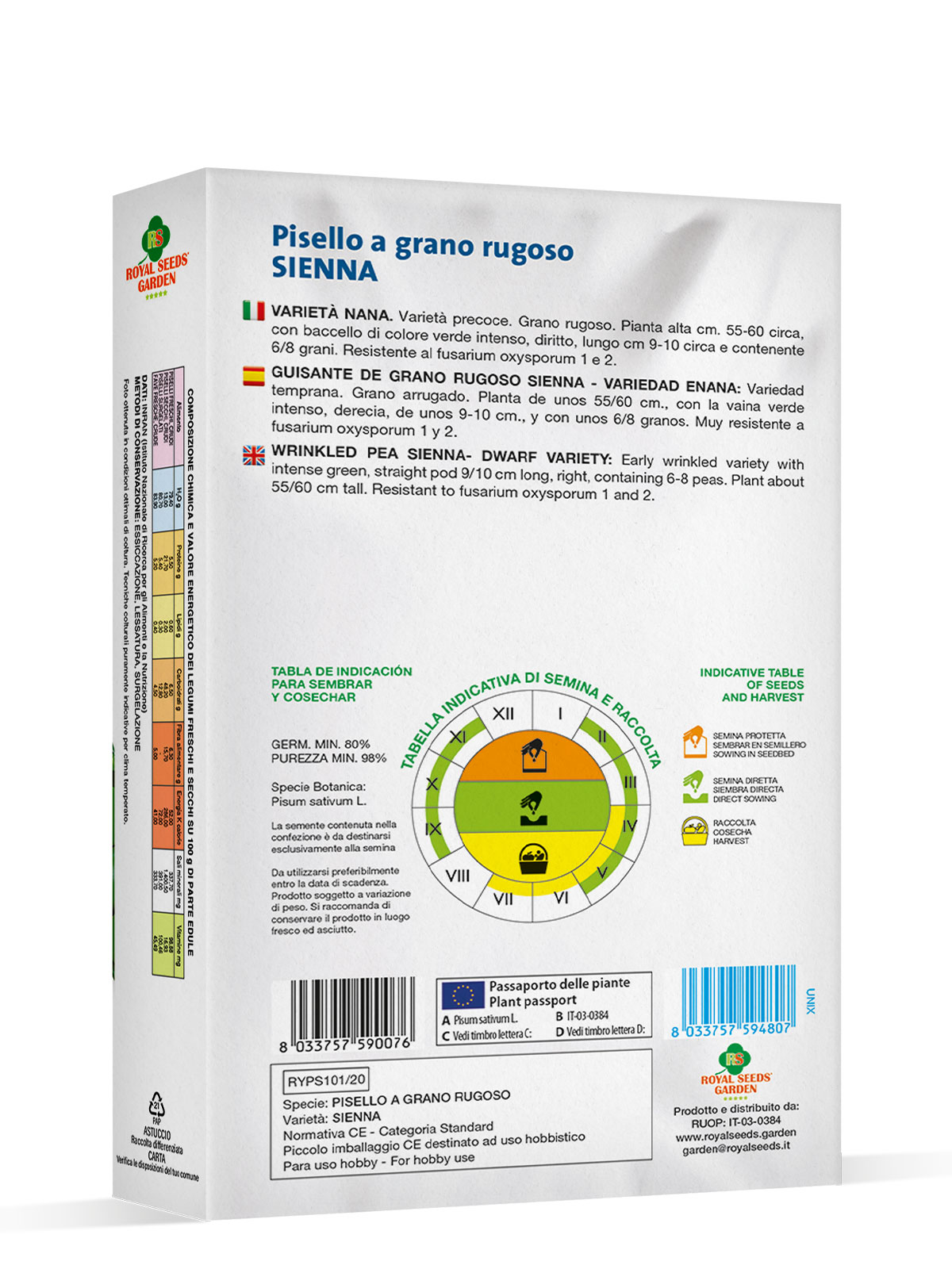 Pisello a grano rugoso Sienna – Varietà precoce. Grano rugoso. Pianta alta cm. 55-60 circa, con baccello di colore verde intenso, diritto, lungo cm 9-10 circa e contenente 6/8 grani. Resistente al fusarium oxysporum 1 e 2.