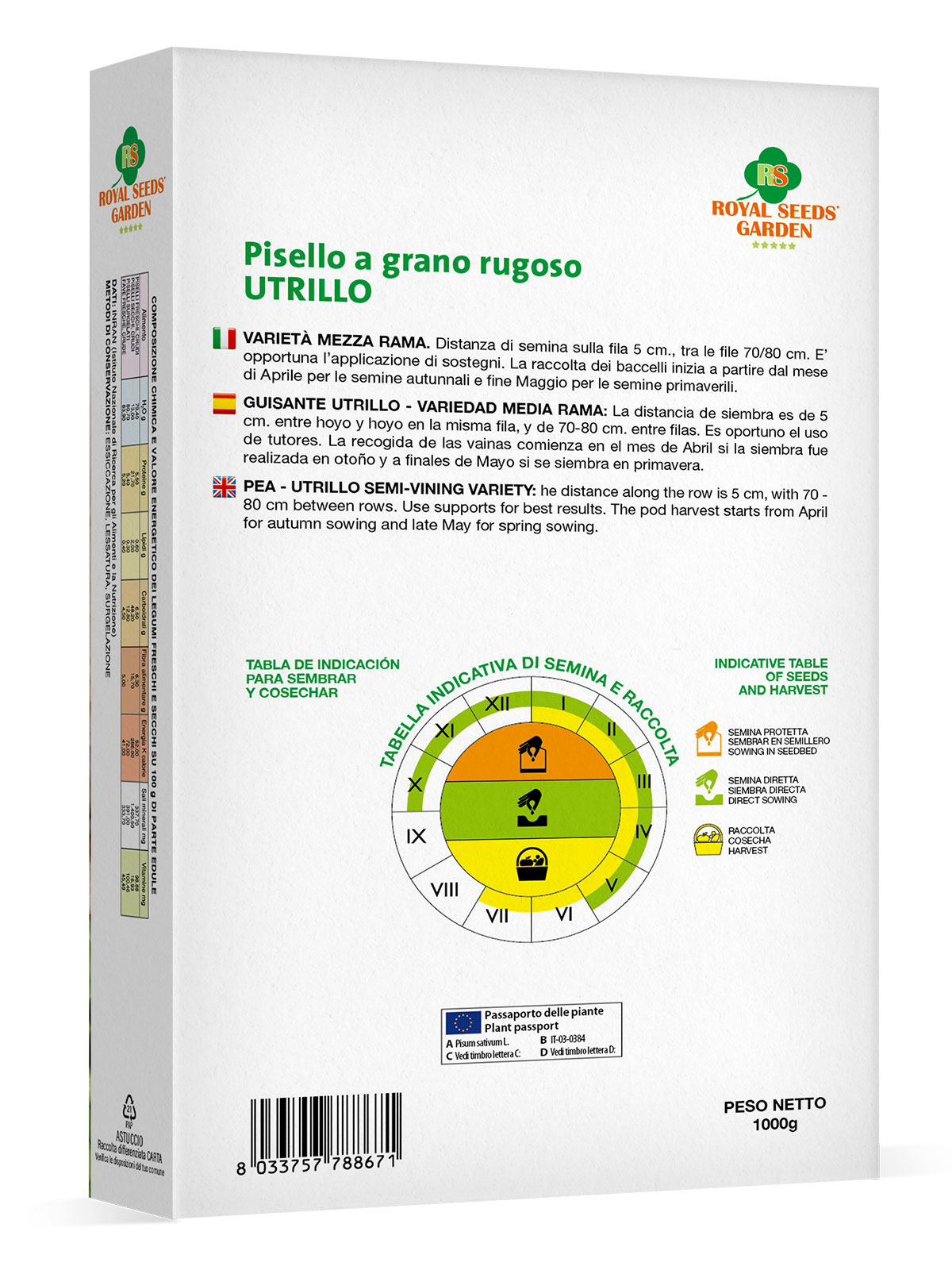 Pisello a grano rugoso Utrillo – Varietà mezzarama. Distanza di semina sulla fila 5 cm., tra le file 70/80 cm. E’ opportuna l’applicazione di sostegni. La raccolta dei baccelli inizia a partire dal mese di Aprile per le semine autunnali e fine Maggio per le semine primaverili.