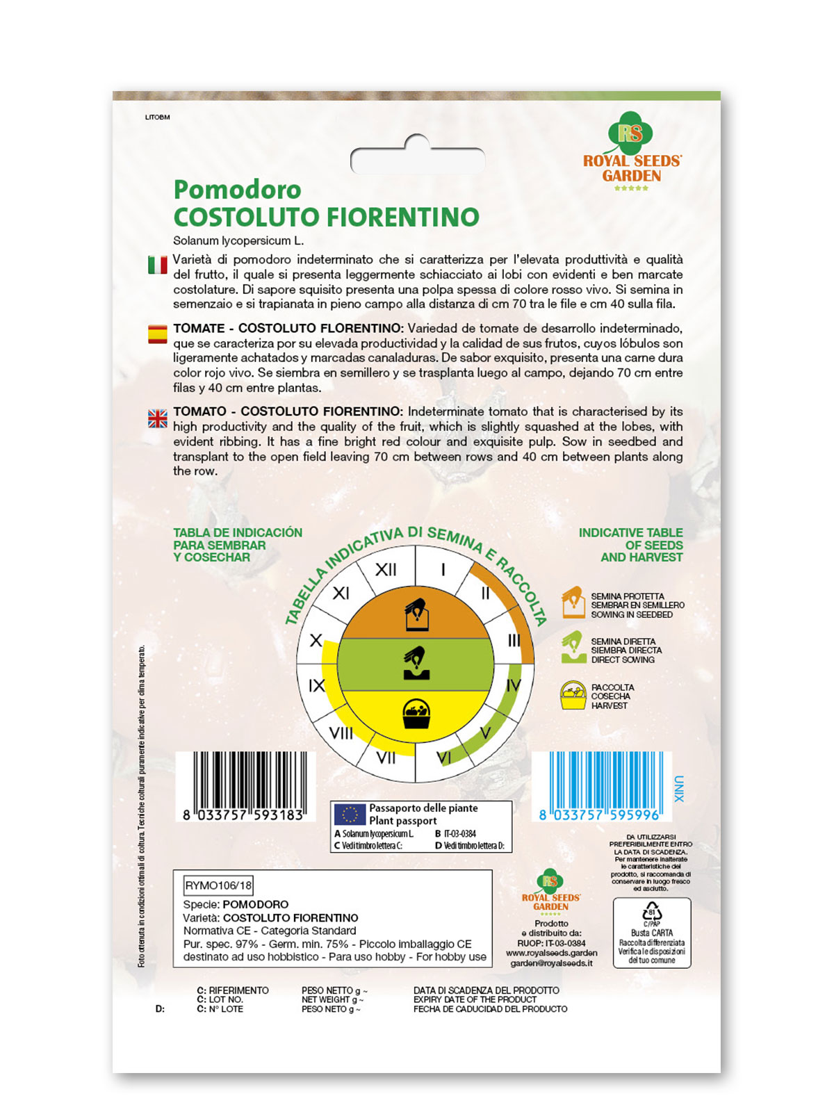 Pomodoro Costoluto fiorentino – Varietà di pomodoro indeterminato che si caratterizza per l’elevata produttività e qualità del frutto, il quale si presenta leggermente schiacciato ai lobi con evidenti e ben marcate costolature. Di sapore squisito presenta una polpa spessa di colore rosso vivo. Si semina in semenzaio e si trapianata in pieno campo alla distanza di cm 70 tra le file e cm 40 sulla fila.