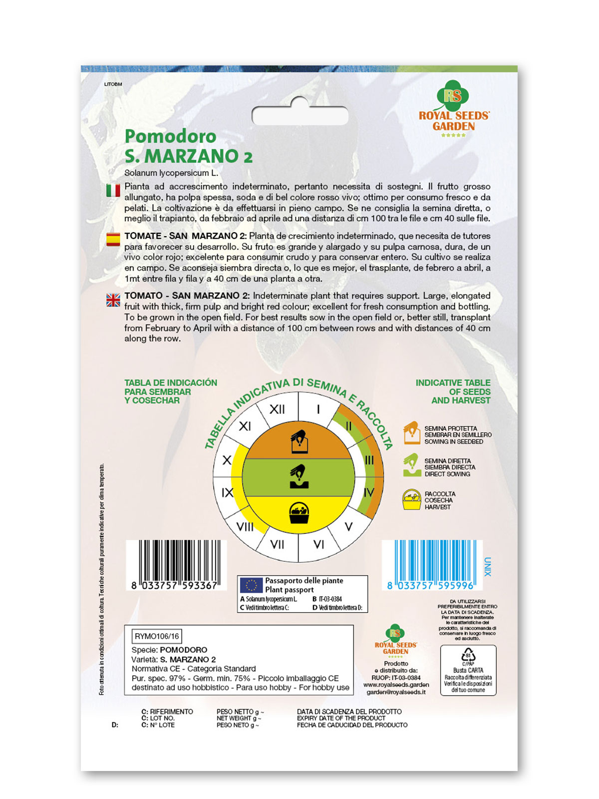 Pomodoro S. Marzano 2 – Pianta ad accrescimento indeterminato, pertanto necessita di sostegni. Il frutto grosso allungato, ha polpa spessa, soda e di bel colore rosso vivo; ottimo per consumo fresco e da pelati. La coltivazione è da effettuarsi in pieno campo. Se ne consiglia la semina diretta, o meglio il trapianto, da febbraio ad aprile ad una distanza di cm 100 tra le file e cm 40 sulle file.