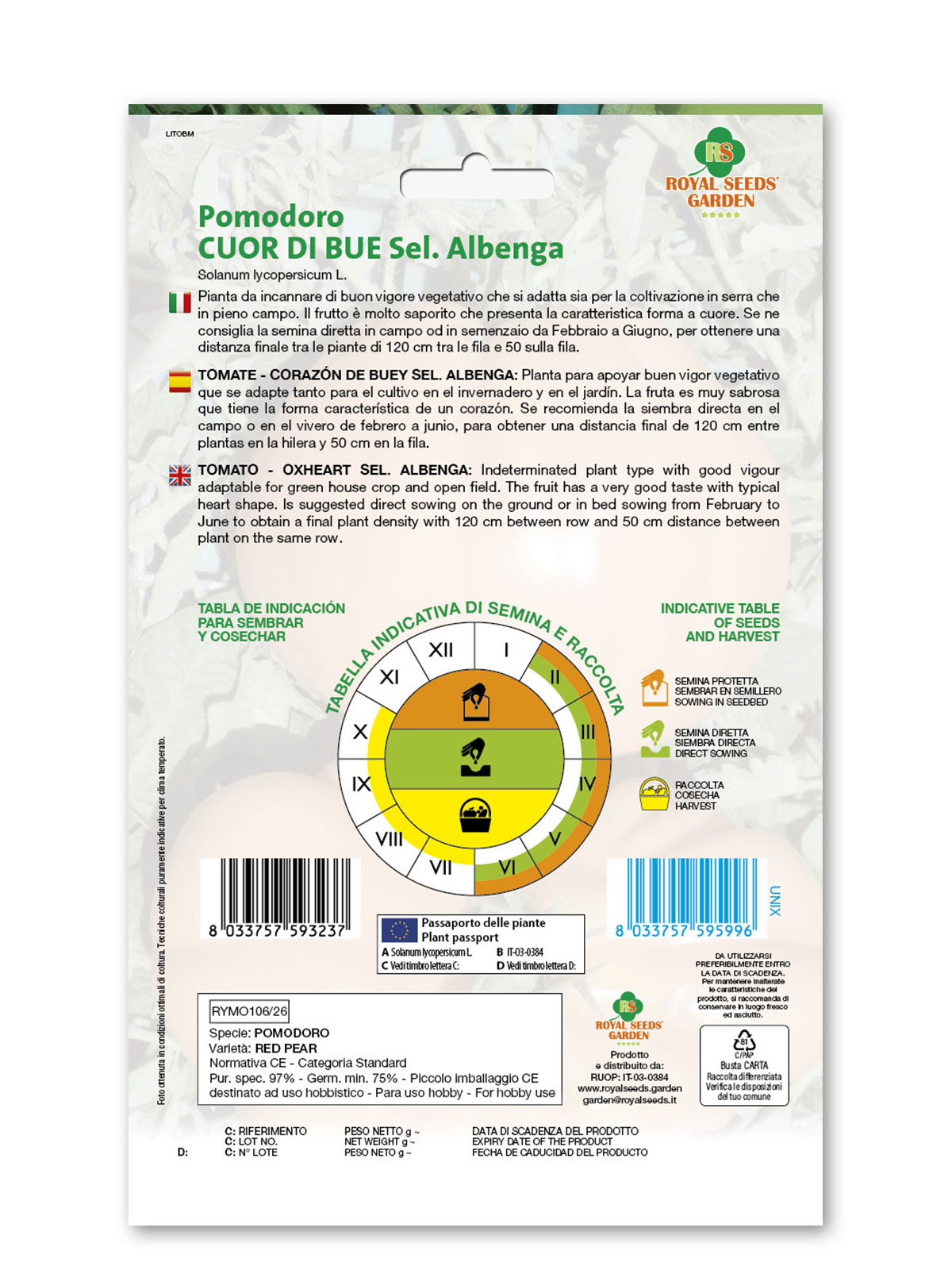 Pomodoro Cuor di bue Albenga – Pianta da incannare di buon vigore vegetativo che si adatta sia per la coltivazione in serra che in pieno campo. Il frutto è molto saporito che presenta la caratteristica forma a cuore. Se ne consiglia la semina diretta in campo od in semenzaio da Febbraio a Giugno, per ottenere una distanza finale tra le piante di 120 cm tra le fila e 50 sulla fila.