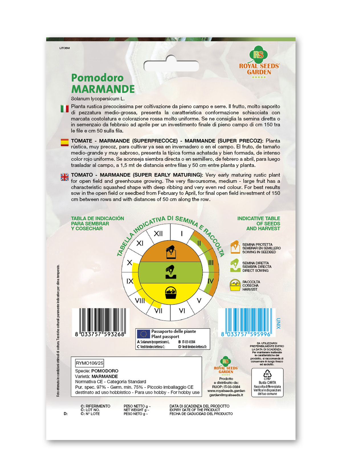 Pomodoro Marmande – Pianta rustica precocissima per coltivazione da pieno campo e serre. Il frutto, molto saporito di pezzatura medio-grossa, presenta la caratteristica conformazione schiacciata con marcata costolatura e colorazione rossa molto uniforme. Se ne consiglia la semina diretta o in semenzaio da febbraio ad aprile per un investimento finale di pieno campo di cm 150 tra le file e cm 50 sulla fila.