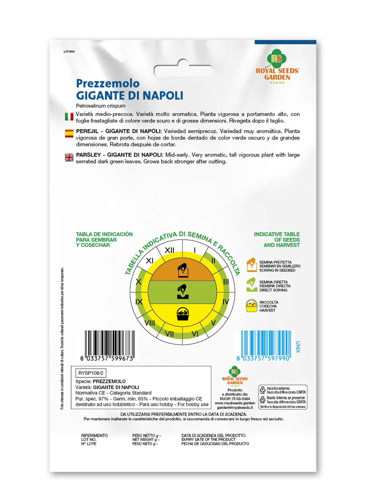 Prezzemolo Gigante di Napoli – Varietà medio-precoce. Varietà molto aromatica. Pianta vigorosa a portamento alto, con foglie frastagliate di colore verde scuro e di grosse dimensioni. Rivegeta dopo il taglio.