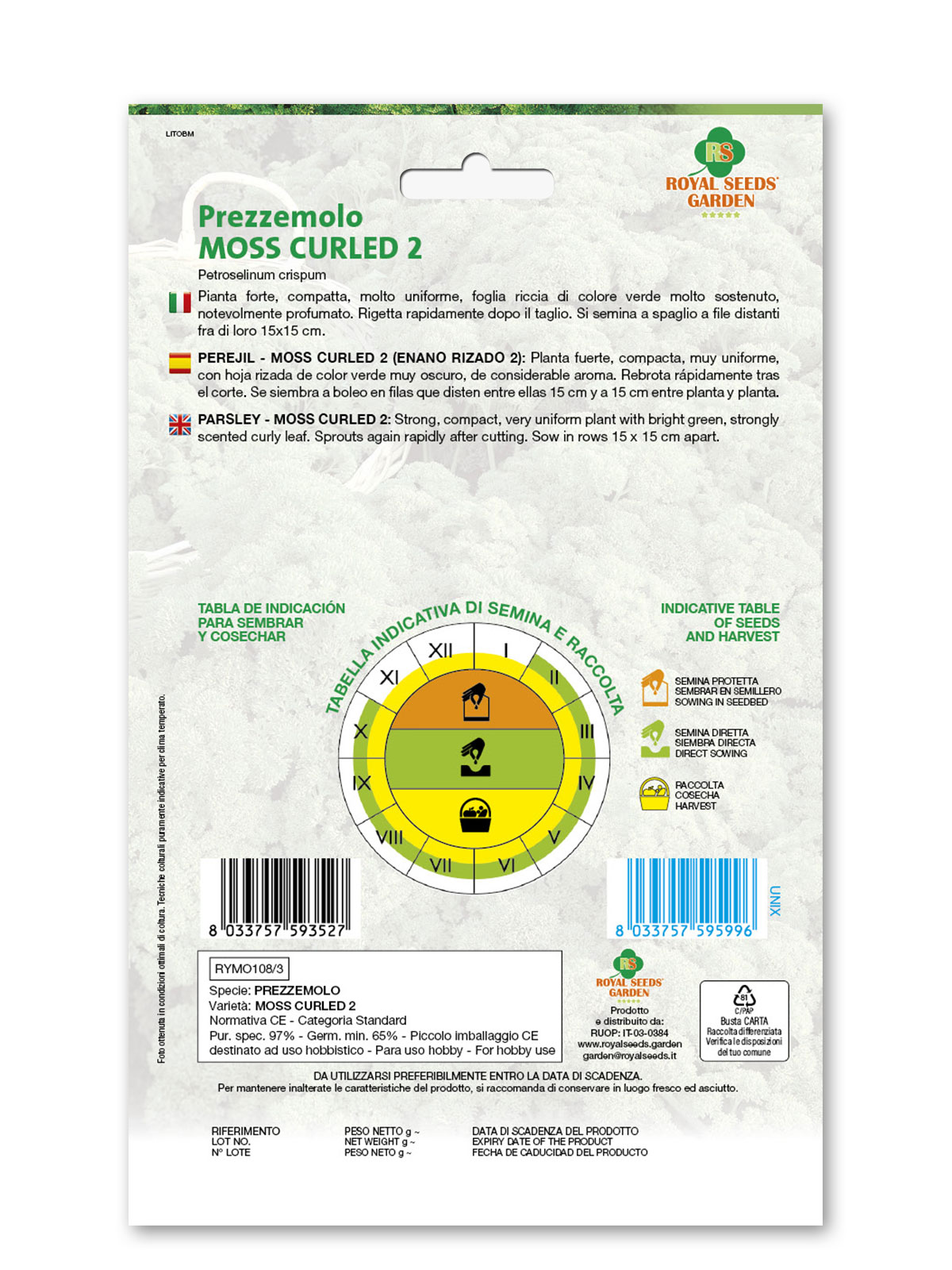 Prezzemolo Moss curled 2 – Pianta forte, compatta, molto uniforme, foglia riccia di colore verde molto sostenuto, notevolmente profumato. Rigetta rapidamente dopo il taglio. Si semina a spaglio a file distanti fra di loro 15×15 cm.