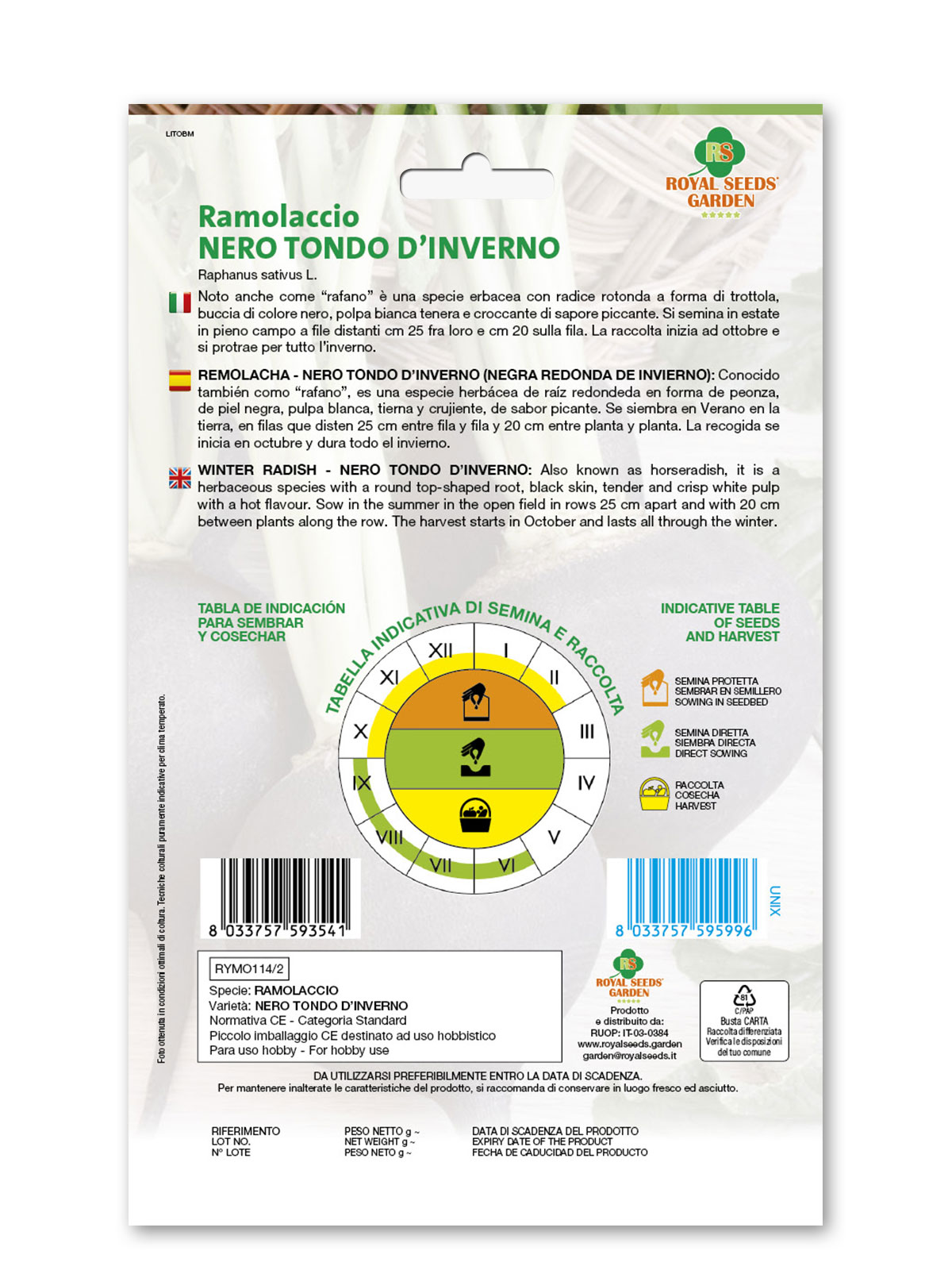 Ramolaccio Nero tondo d’inverno – Noto anche come “rafano” è una specie erbacea con radice rotonda a forma di trottola, buccia di colore nero, polpa bianca tenera e croccante di sapore piccante. Si semina in estate in pieno campo a file distanti cm 25 fra loro e cm 20 sulla fila. La raccolta inizia ad ottobre e si protrae per tutto l’inverno.