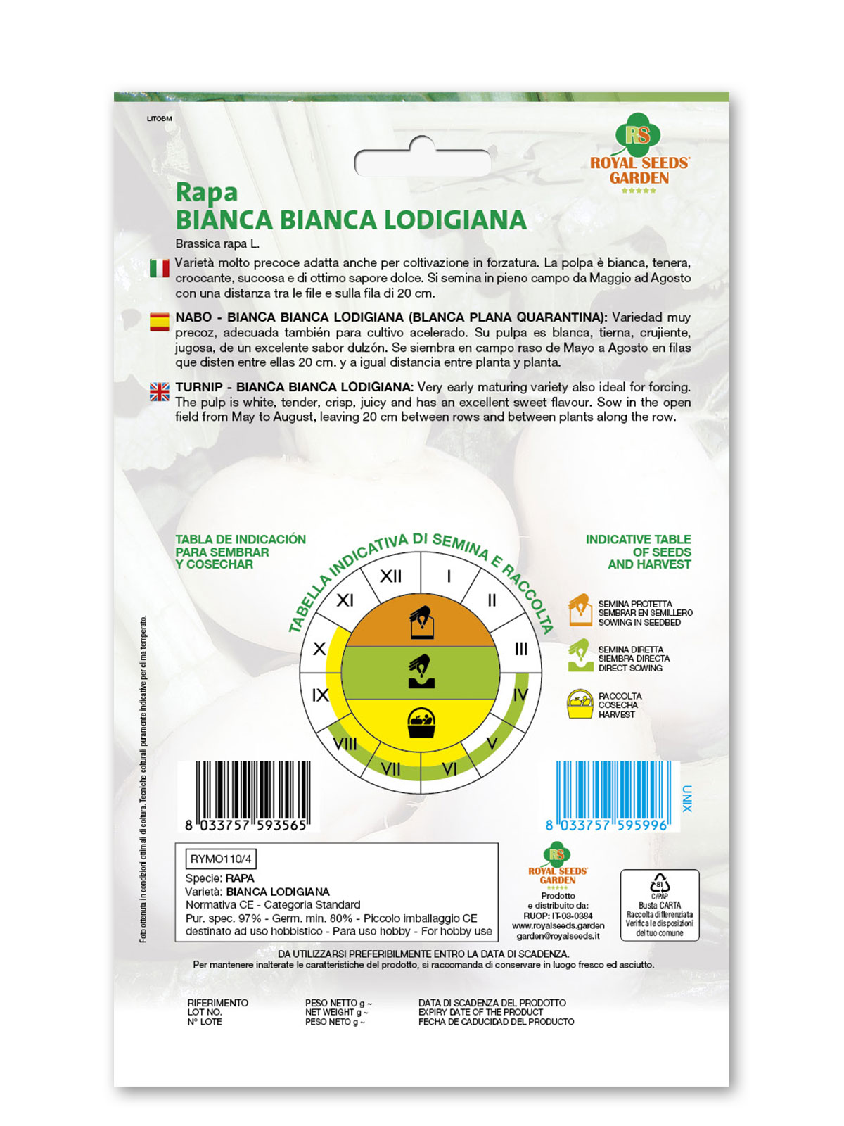 Rapa Bianca lodigiana – Varietà molto precoce adatta anche per coltivazione in forzatura. La polpa è bianca, tenera, croccante, succosa e di ottimo sapore dolce. Si semina in pieno campo da Maggio ad Agosto con una distanza tra le file e sulla fila di 20 cm.