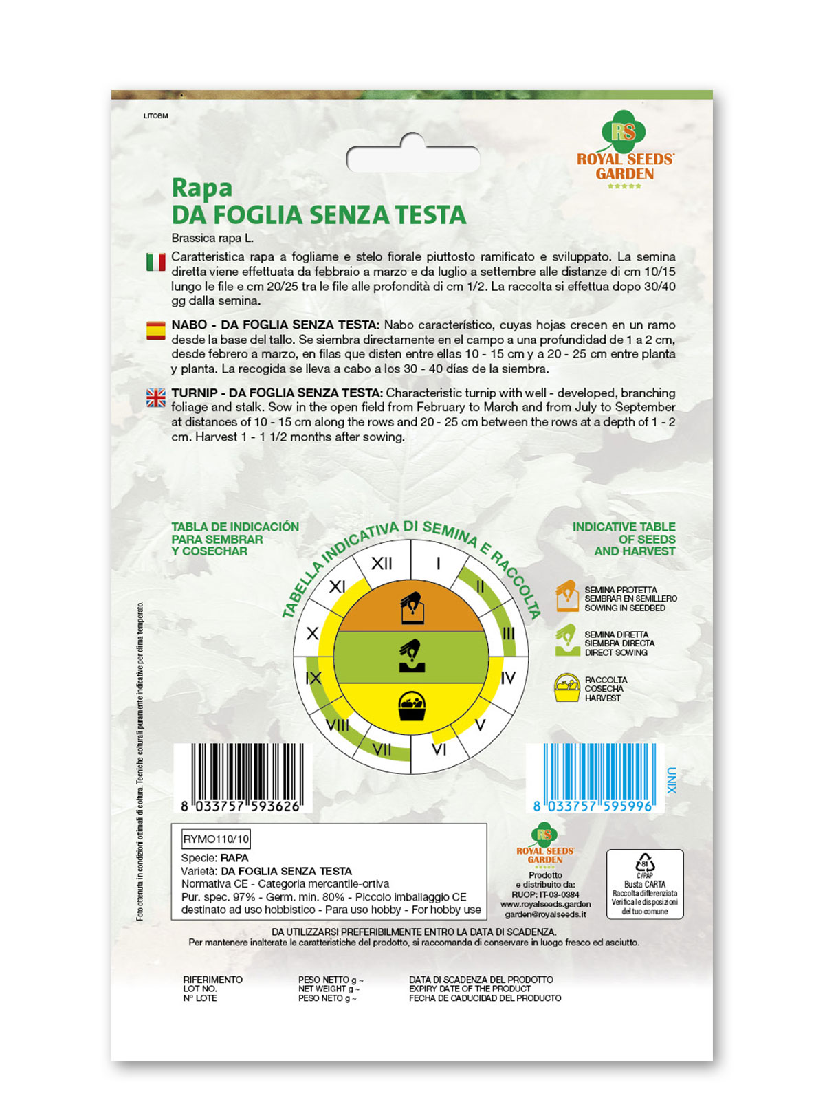 Rapa da foglia senza testa – Caratteristica rapa a fogliame e stelo fiorale piuttosto ramificato e sviluppato. La semina diretta viene effettuata da febbraio a marzo e da luglio a settembre alle distanze di cm 10/15 lungo le file e cm 20/25 tra le file alle profondità di cm 1/2. La raccolta si effettua dopo 30/40 gg dalla semina.