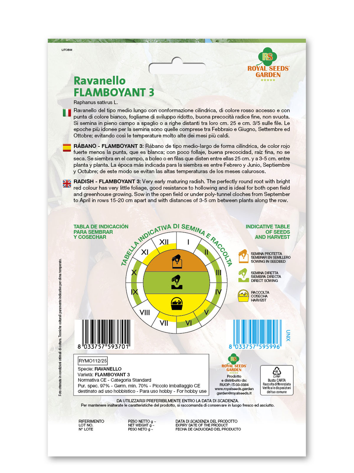Ravanello Flamboyant 3 – Ravanello del tipo medio lungo con conformazione cilindrica, di colore rosso accesso e con punta di colore bianco, fogliame di sviluppo ridotto, buona precocità radice fine, non svuota. Si semina in pieno campo a spaglio o a righe distanti tra loro cm. 25 e cm. 3/5 sulle file. Le epoche più idonee per la semina sono quelle comprese tra Febbraio e Giugno, Settembre ed Ottobre; evitando così le temperature molto alte dei mesi più caldi.