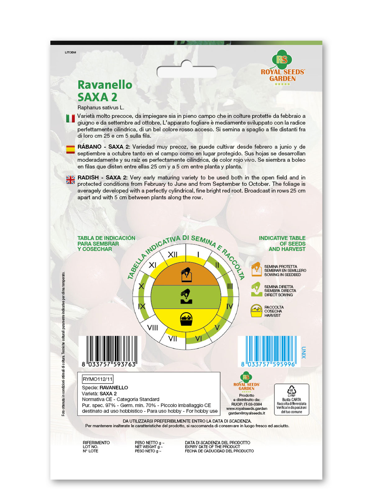Ravanello Saxa 2 – Varietà molto precoce, da impiegare sia in pieno campo che in colture protette da febbraio a giugno e da settembre ad ottobre. L’apparato fogliare è mediamente sviluppato con la radice perfettamente cilindrica, di un bel colore rosso acceso. Si semina a spaglio a file distanti fra di loro cm 25 e cm 5 sulla fila.