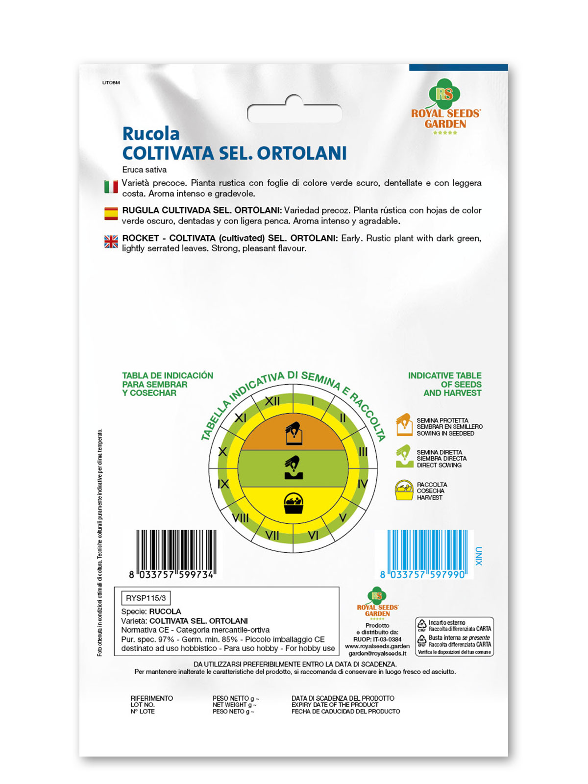 Rocket Cultivated sel. Ortolani – Early. Rustic plant with dark green, lightly serrated leaves. Strong, pleasant flavour.