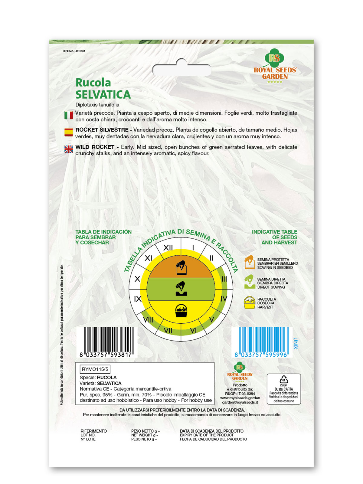 Rucola Selvatica – Varietà precoce. Pianta a cespo aperto, di medie dimensioni. Foglie verdi, molto frastagliate con costa chiara, croccanti e dall’aroma molto intenso.