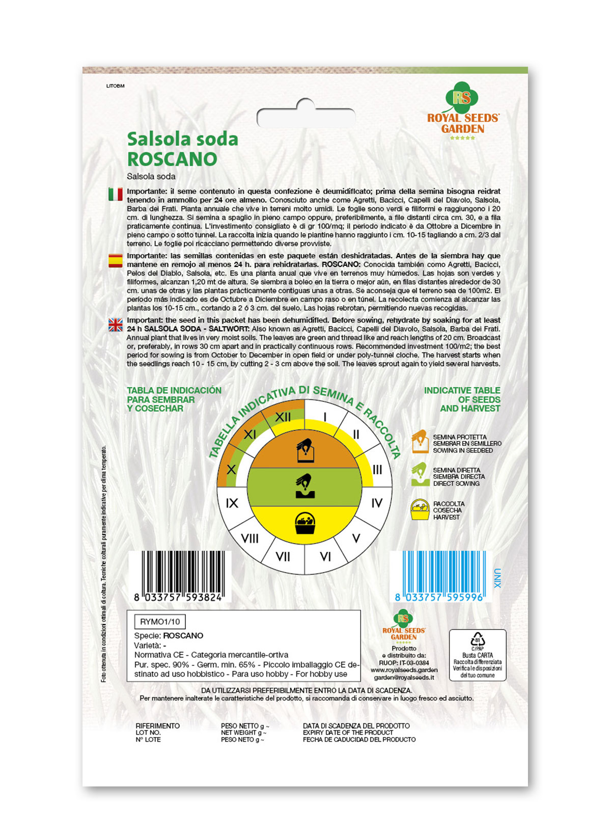 Agretto o roscano – Importante: il seme contenuto in questa confezione è deumidificato; prima della semina bisogna reidratare tenendo in ammollo per 24 ore almeno. Conosciuto anche come Agretti, Bacicci, Capelli del Diavolo, Salsola, Barba dei Frati. Pianta annuale che vive in terreni molto umidi. Le foglie sono verdi e filiformi e raggiungono i 20 cm. di lunghezza. Si semina a spaglio in pieno campo oppure, preferibilmente, a file distanti circa cm. 30, e a fila praticamente continua. L’investimento consigliato è di gr 100/mq; il periodo indicato è da Ottobre a Dicembre in pieno campo o sotto tunnel. La raccolta inizia quando le piantine hanno raggiunto i cm. 10-15 tagliando a cm. 2/3 dal terreno. Le foglie poi ricacciano permettendo diverse provviste.