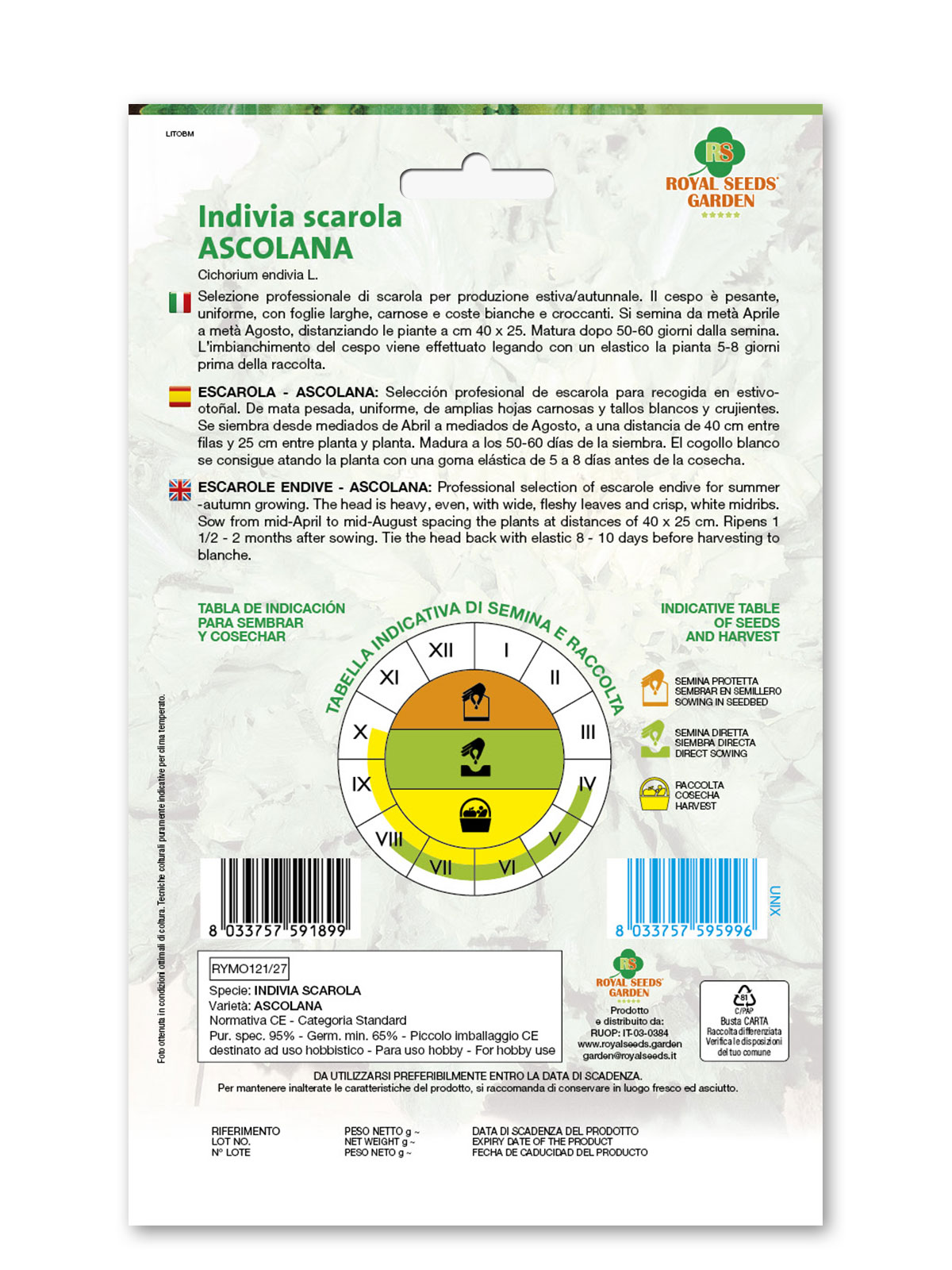 Indivia scarola ascolana – Selezione professionale di scarola per produzione estiva/autunnale. Il cespo è pesante, uniforme, con foglie larghe, carnose e coste bianche e croccanti. Si semina da metà Aprile a metà Agosto, distanziando le piante a cm 40 x 25. Matura dopo 50-60 giorni dalla semina. L’imbianchimento del cespo viene effettuato legando con un elastico la pianta 5-8 giorni prima della raccolta.