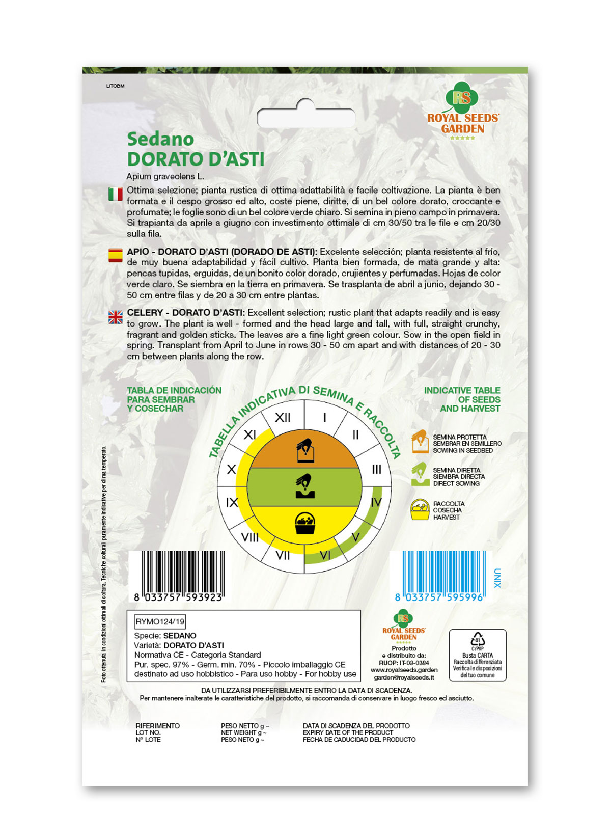 Sedano dorato d’Asti – Ottima selezione; pianta rustica di ottima adattabilità e facile coltivazione. La pianta è ben formata e il cespo grosso ed alto, coste piene, diritte, di un bel colore dorato, croccante e profumate; le foglie sono di un bel colore verde chiaro. Si semina in pieno campo in primavera. Si trapianta da aprile a giugno con investimento ottimale di cm 30/50 tra le file e cm 20/30 sulla fila.