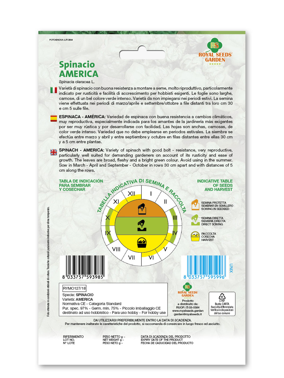 Spinacio America – Varietà di spinacio con buona resistenza a montare a seme, molto riproduttivo, particolarmente indicato per rusticità e facilità di accrescimento per hobbisti esigenti. Le foglie sono larghe, carnose, di un bel colore verde intenso. Varietà da non impiegarsi nei periodi estivi. La semina viene effettuata nei periodi di marzo/aprile e settembre/ottobre a file distanti tra loro cm 30 e cm 5 sulle file.