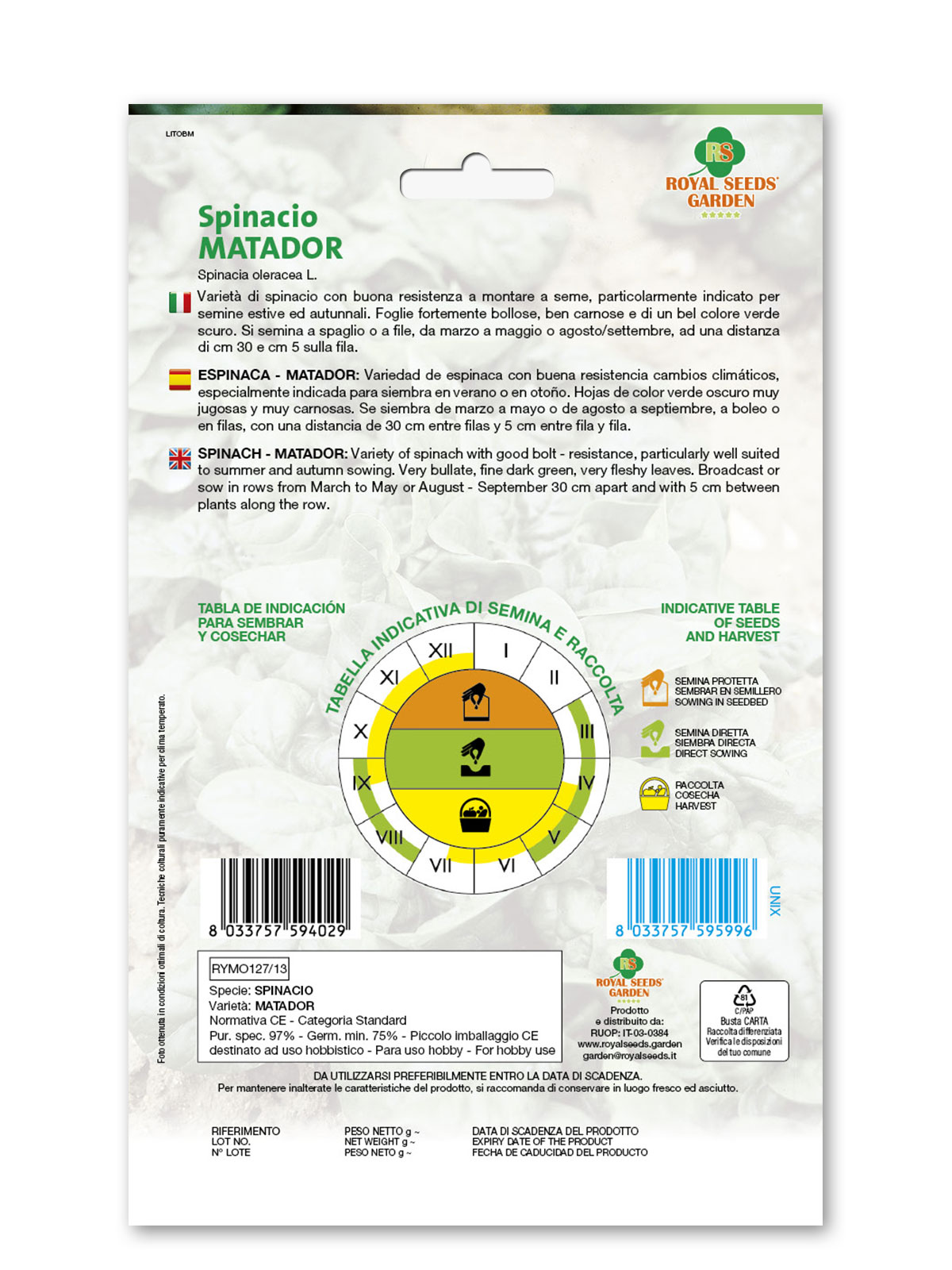 Spinacio Matador – Varietà di spinacio con buona resistenza a montare a seme, particolarmente indicato per semine estive ed autunnali. Foglie fortemente bollose, ben carnose e di un bel colore verde scuro. Si semina a spaglio o a file, da marzo a maggio o agosto/settembre, ad una distanza di cm 30 e cm 5 sulla fila.