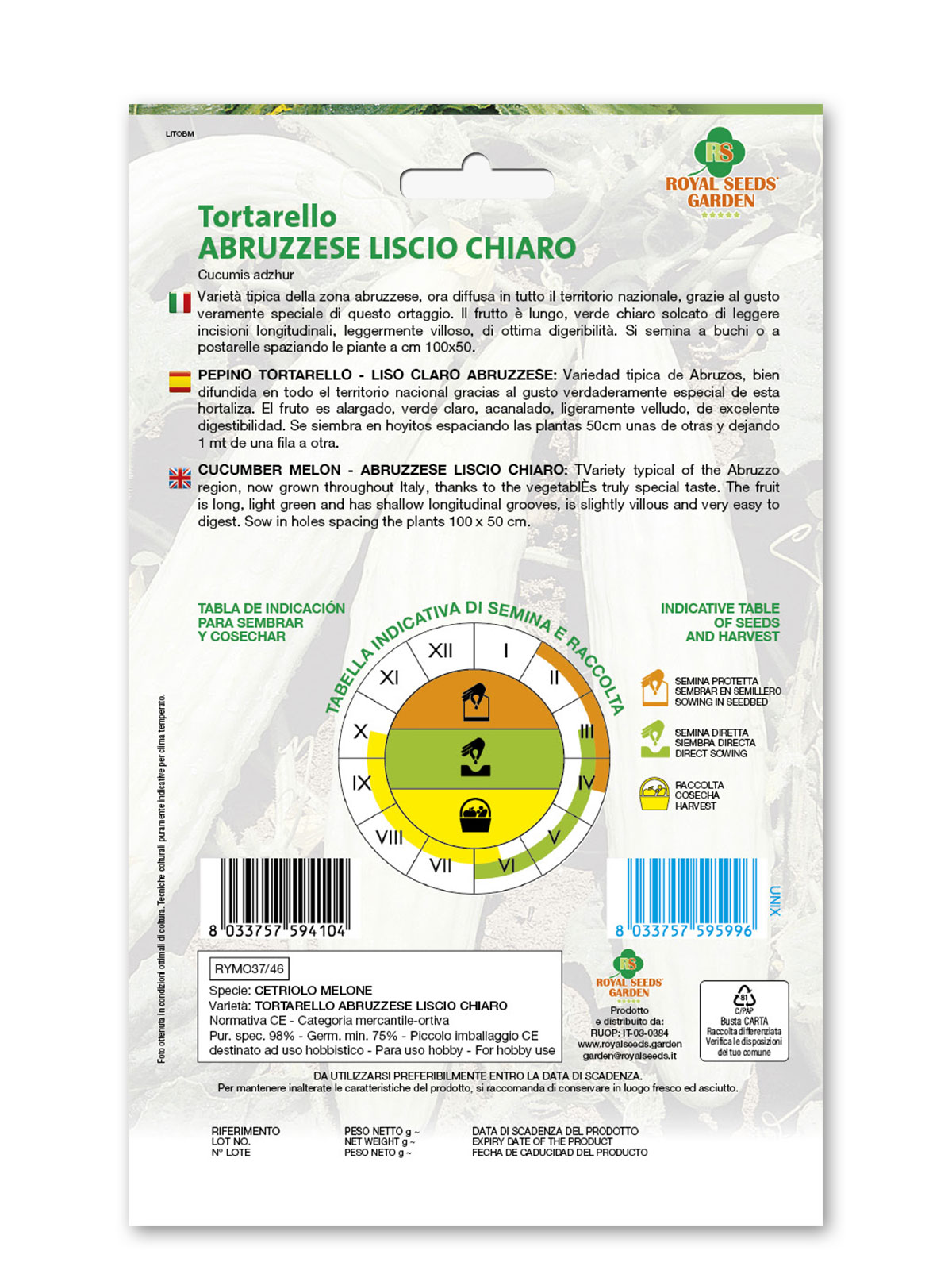 Cetriolo melone Tortarello abruzzese liscio chiaro – Varietà tipica della zona abruzzese, ora diffusa in tutto il territorio nazionale, grazie al gusto veramente speciale di questo ortaggio. Il frutto è lungo, verde chiaro solcato di leggere incisioni longitudinali, leggermente villoso, di ottima digeribilità. Si semina a buchi o a postarelle spaziando le piante a cm 100×50.