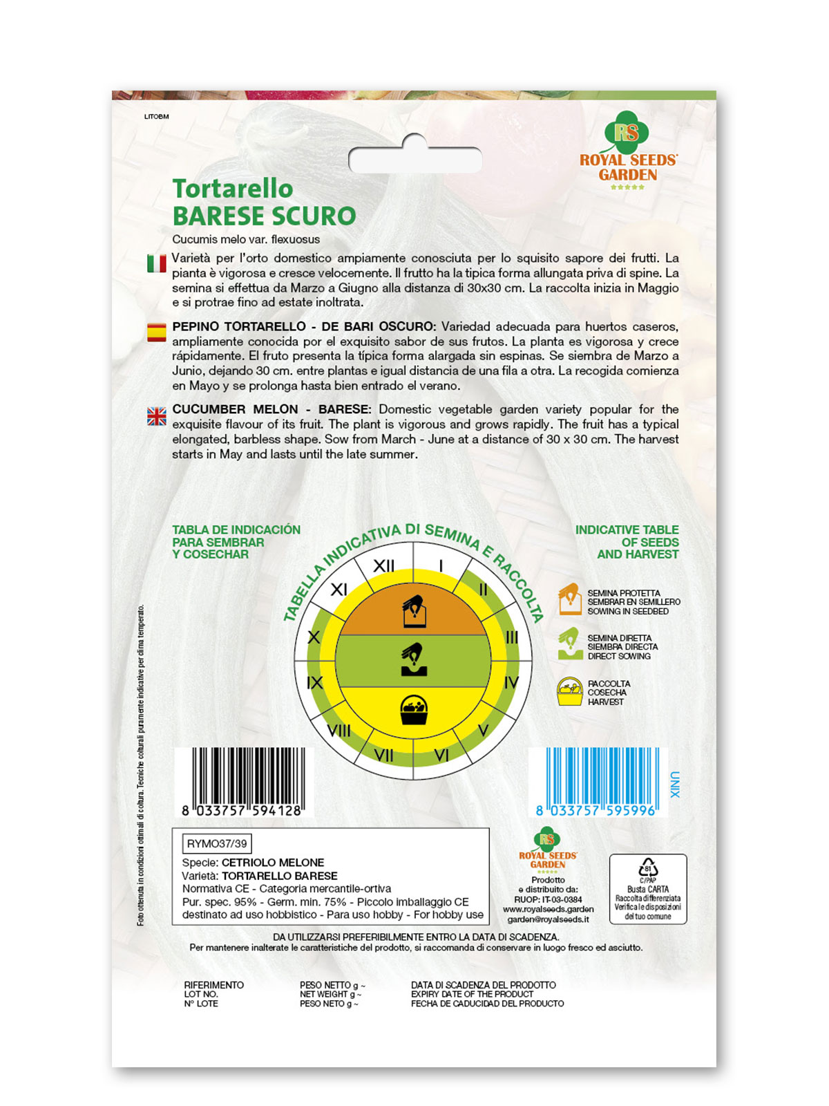 Cucumber melon tortarello barese – Domestic vegetable garden variety popular for the exquisite flavour of its fruit. The plant is vigorous and grows rapidly. The fruit has a typical elongated, barbless shape. Sow from March – June at a distance of 30 x 30 cm. The harvest starts in May and lasts until the late summer.