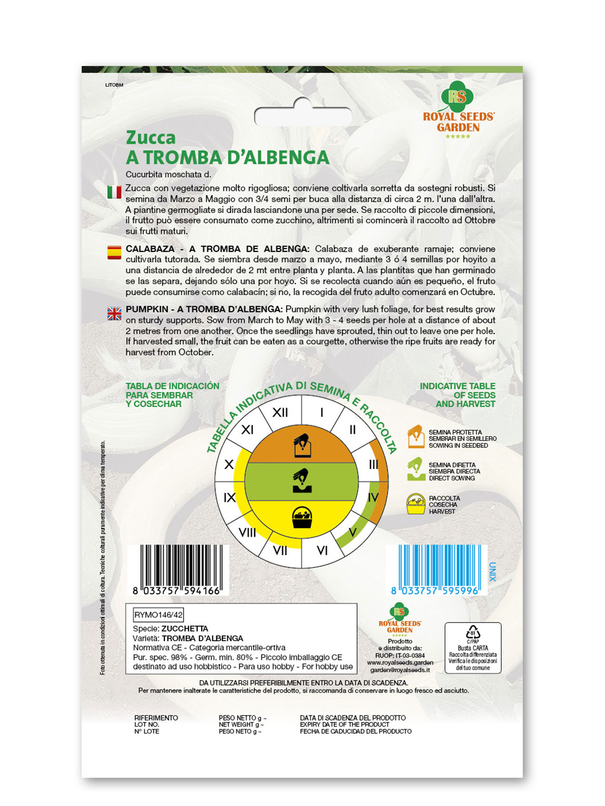 Zucca tromba d’Albenga – Zucca con vegetazione molto rigogliosa; conviene coltivarla sorretta da sostegni robusti. Si semina da Marzo a Maggio con 3/4 semi per buca alla distanza di circa 2 m. l’una dall’altra. A piantine germogliate si dirada lasciandone una per sede. Se raccolto di piccole dimensioni, il frutto può essere consumato come zucchino, altrimenti si comincerà il raccolto ad Ottobre sui frutti maturi.